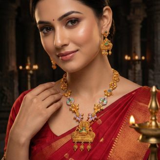 Elevate your traditional collection with this exquisite 916 Gold Antique Necklace. Featuring a divine Goddess Lakshmi pendant flanked by peacocks and adorned with unique pastel purple enamel (Meenakari) floral work, this handcrafted masterpiece blends heritage design with modern elegance. Perfect for weddings and festive occasions.”