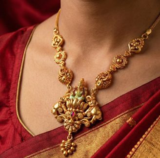 Adorn yourself with blessings. This exquisite 22K (916) Gold Necklace features a detailed Gajalakshmi pendant resting on a traditional floral chain. With its antique finish and delicate hanging gold beads, this short necklace captures the timeless beauty of heritage Indian jewellery.