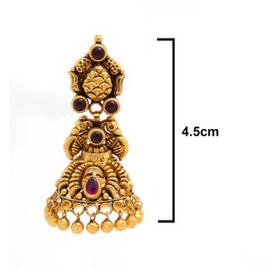 antique jhumka earrings featuring an intricate Temple Jewelry design. These unique 22K gold bell-shaped earrings are embellished with rich ruby stones,