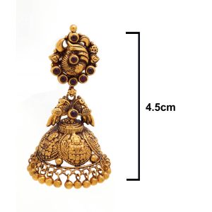 This pair of 22k Gold jhumkkas features a lakshmi design and adorned with kemp stones for a fine look.