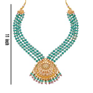 Luxurious 22K gold multi-strand emerald beaded haram with ornate gold pendant. Handcrafted traditional long necklace with precious gemstones and filigree work