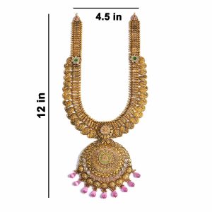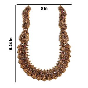exquisite Antique Gold Long Necklace (Haram). Expertly crafted to reflect the grandeur of South Indian temple architecture, this piece is a testament to timeless tradition and superior craftsmanship.