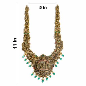 Antique Gold Long Necklace (Haram). Centered around the auspicious Ram Parivar, this piece is a stunning example of traditional “Nakshi” (carving) work, designed to make you look regal on your special day