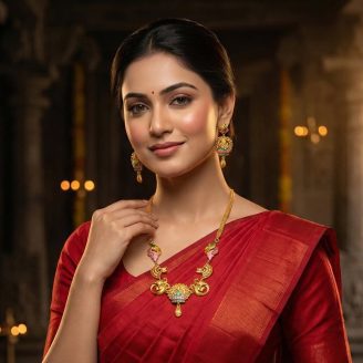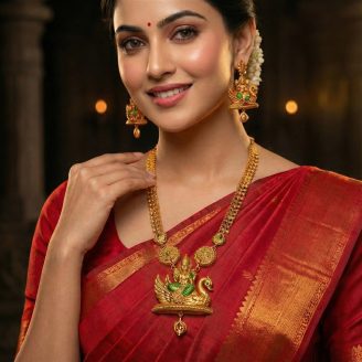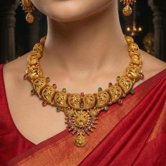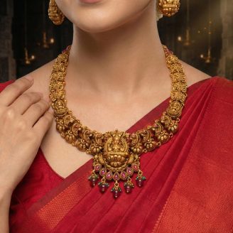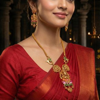The centerpiece features a detailed engraving of Goddess Lakshmi seated on a lotus, surrounded by majestic peacocks and floral artistry. Accented with vibrant pink stones and dangling emerald-green beads, this Temple Jewellery masterpiece is the perfect heirloom for brides and festive occasions.”