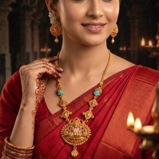 Embrace divine elegance with this 916 hallmark gold necklace featuring a detailed Goddess Lakshmi pendant. Intricately designed with floral motifs, studded with radiant pink and white stones, and finished with delicate pearl drops, this traditional piece is perfect for festive wear and bridal trousseaus.