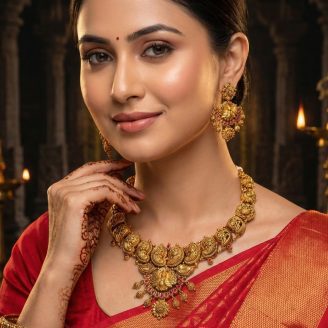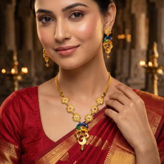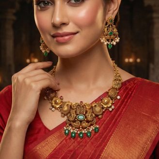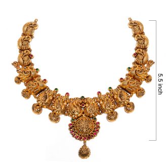 ₹279,171.75916 Hallmarked Gold Necklace. Crafted in a heritage antique style, this piece features a classic South Indian Mango (Manga) chain leading to a majestic Peacock (Annam) pendant. Adorned with vibrant red stones and hanging gold beads, it is the perfect bridal accessory.