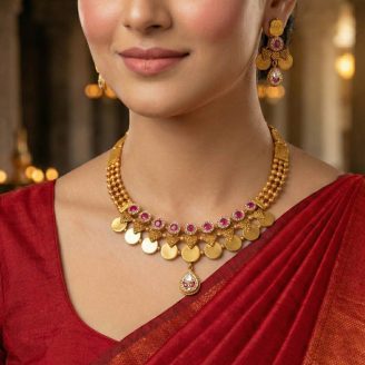 ₹230,760.66916 Hallmarked Gold Necklace. Featuring a stunning peacock (mayur) motif accented with vibrant blue and green enamel (meenakari) work, this 12-inch necklace blends classic artistry with modern elegance. Finished with a delicate heart charm, it is the perfect lightweight gold jewelry piece for festive occasions and daily wear.