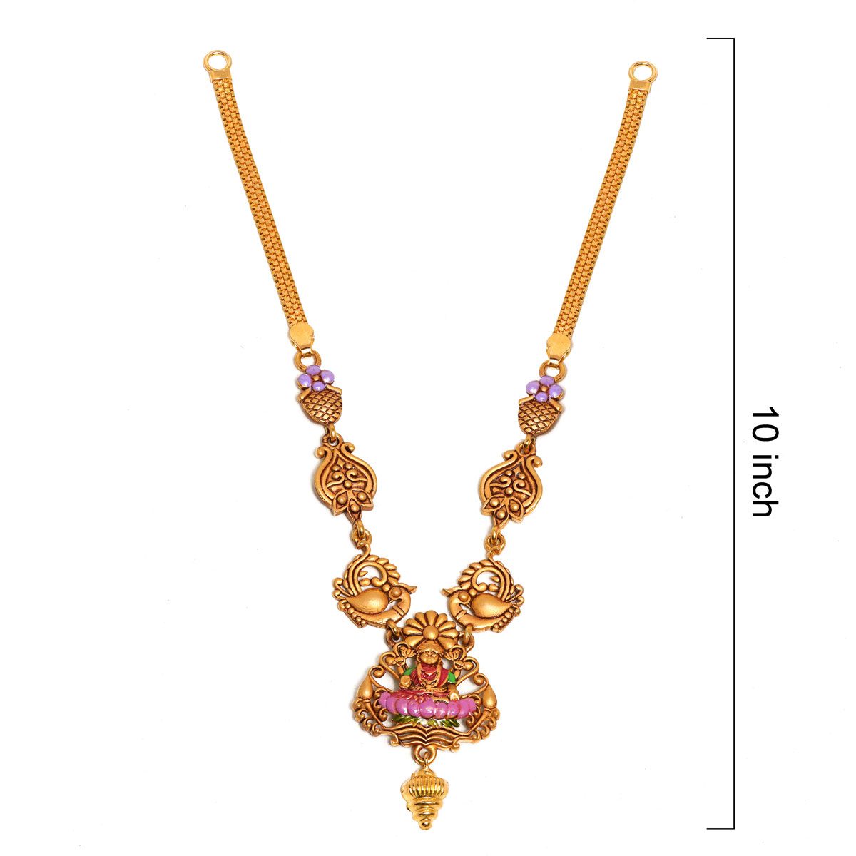 Centered around a beautifully detailed Goddess Lakshmi pendant seated on a lotus, this piece is flanked by graceful peacock (Annapakshi) motifs. Accented with delicate purple and green enamel work, this traditional temple jewellery masterpiece is crafted in pure 22K gold, making it the perfect auspicious addition to your festive or bridal collection.”
