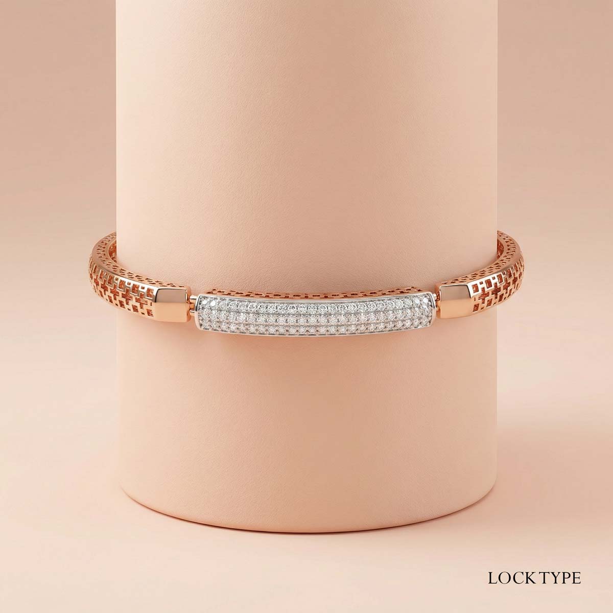 18k Rose Gold Minimalist Diamond Bracelet. Designed for the modern woman, this piece features a sleek rectangular bar encrusted with brilliant-cut diamonds, set against a unique geometric lattice band
