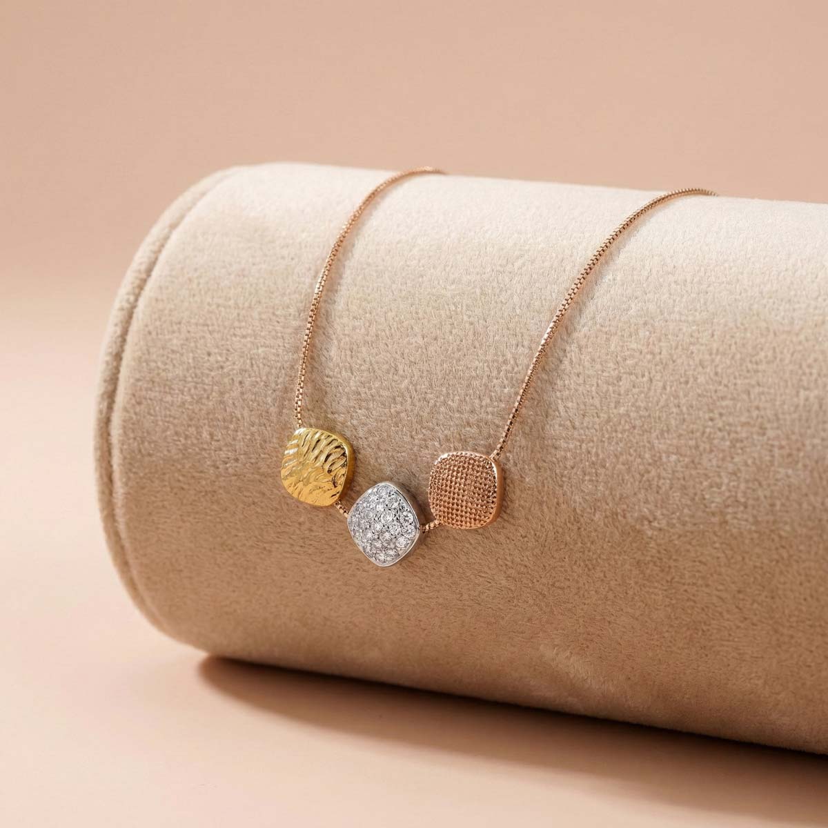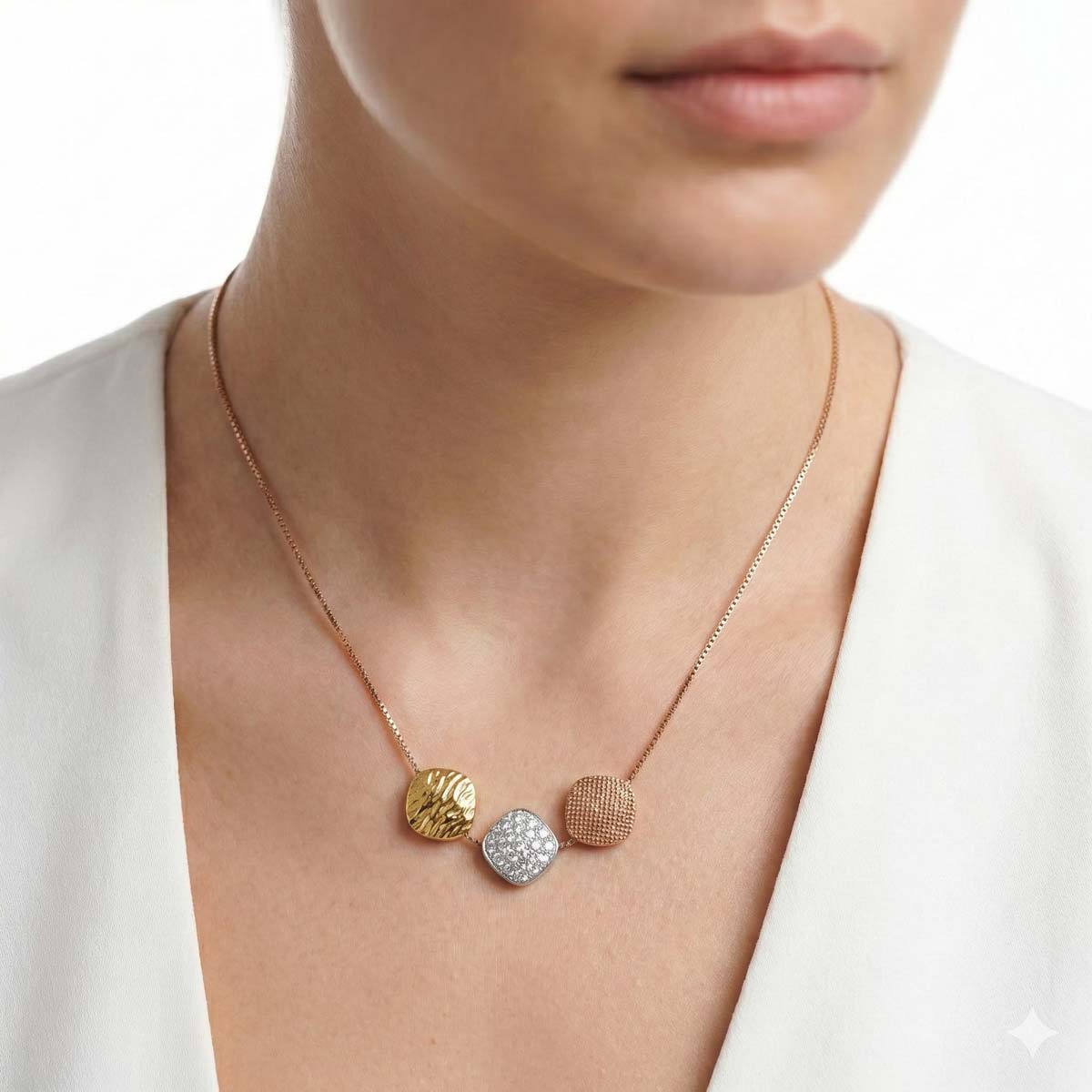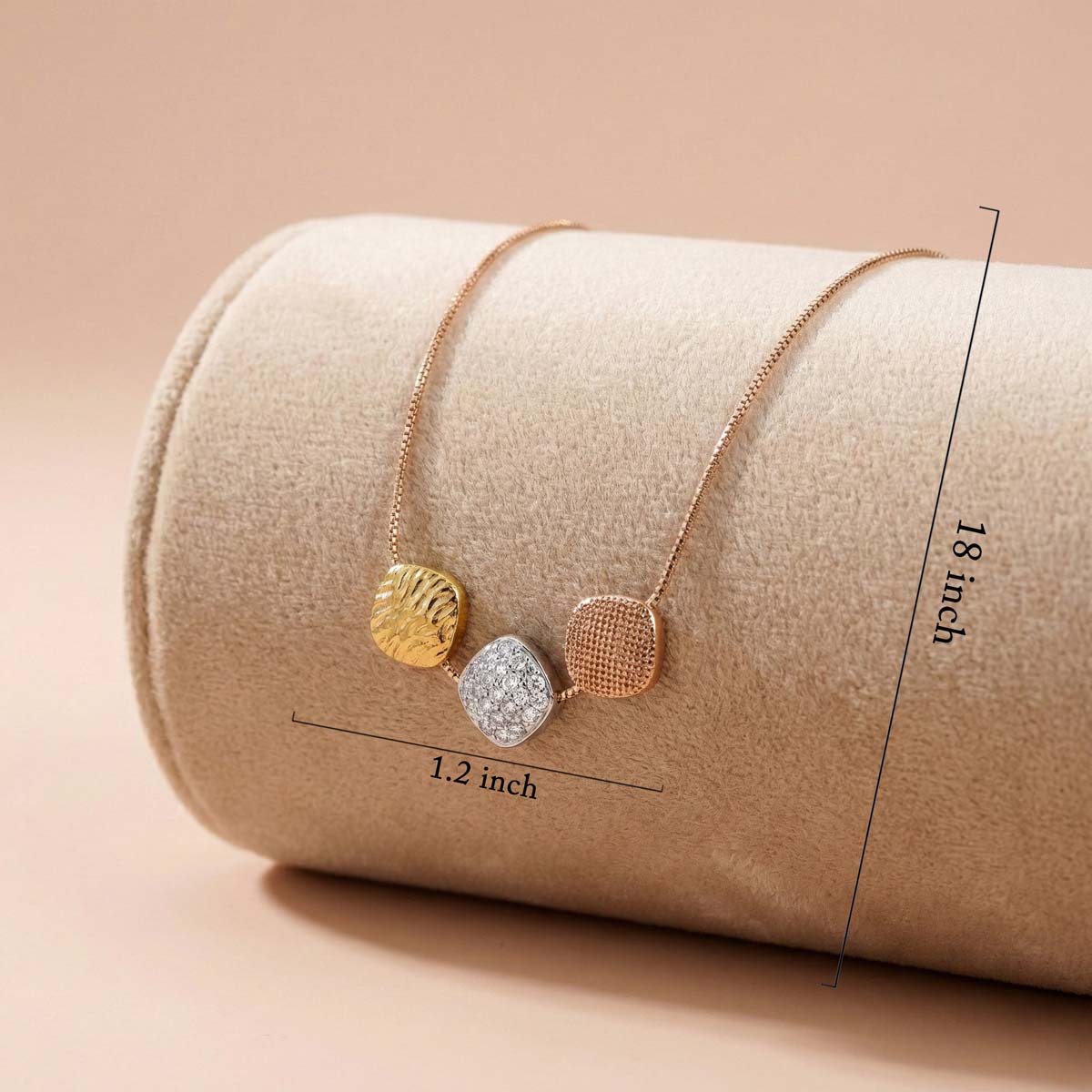 “Shop this 18k Gold Tri-Tone Minimalist Necklace at OVJ Jewels. A modern geometric pendant chain in rose, white, & yellow gold. Perfect for daily wear. Free Shipping.”