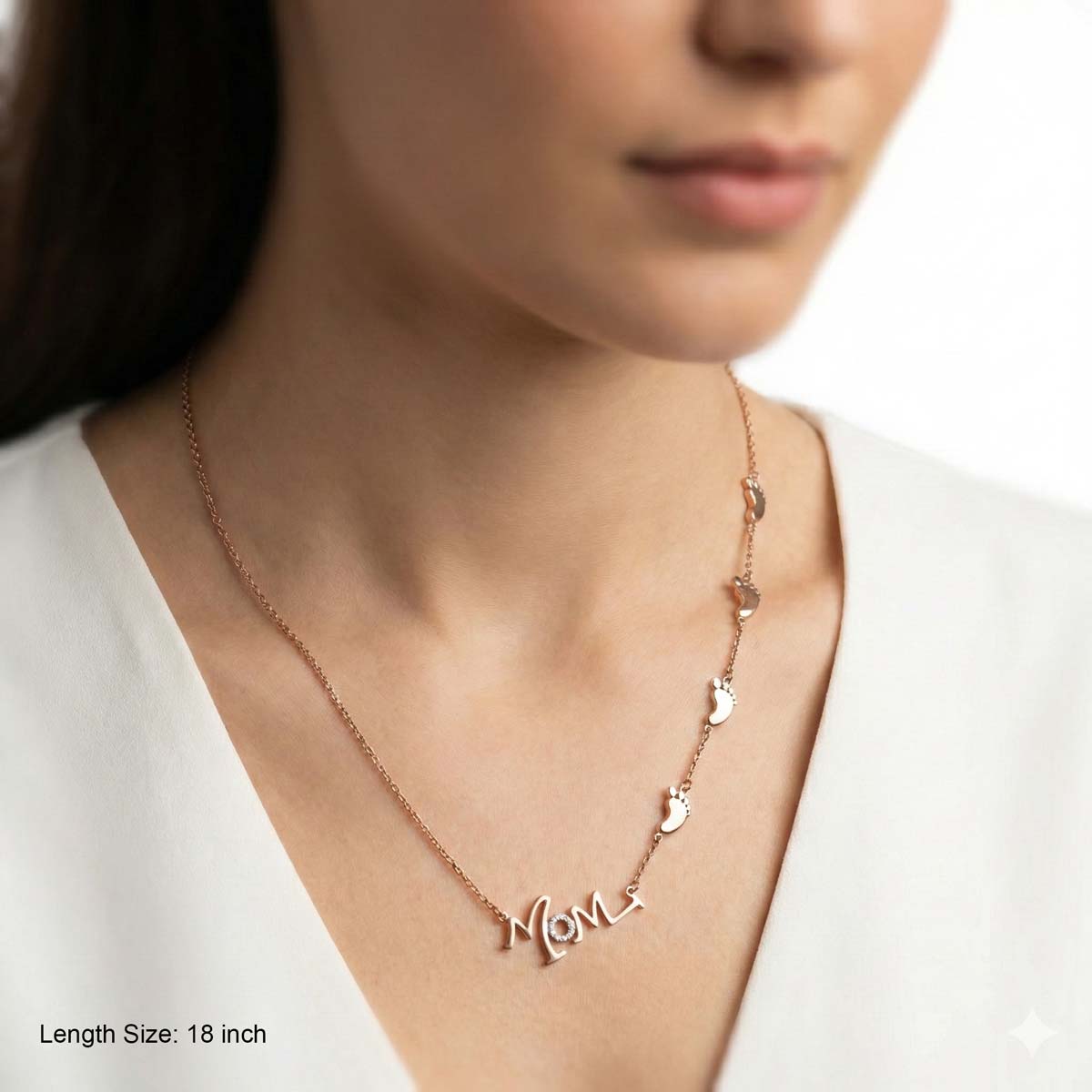 Celebrate the journey of motherhood with this elegant 18K rose gold minimalist chain. Featuring a diamond-studded “MOM” centerpiece and adorable baby feet accents, it’s a timeless tribute to a mother’s love. Handcrafted for everyday elegance.