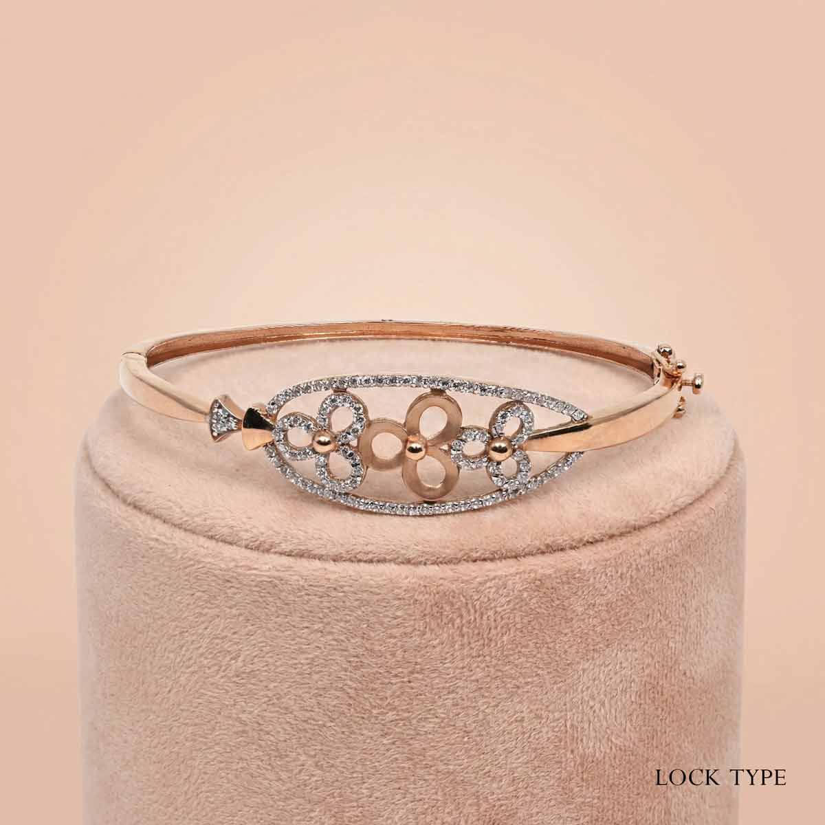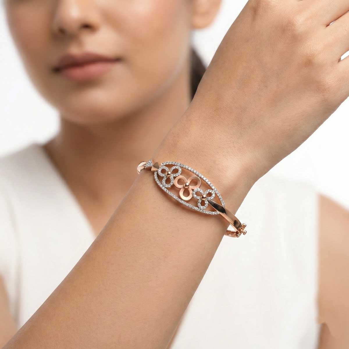 Exquisitely crafted in 18k Rose Gold, this hinged bracelet features a contemporary oval centerpiece with a delicate trio of floral motifs—accented by brilliant-cut diamonds.Designed for the modern woman, its secure lock mechanism and lightweight profile make it the perfect minimalist accessory for office wear or evening elegance.