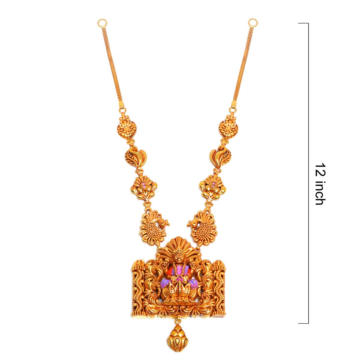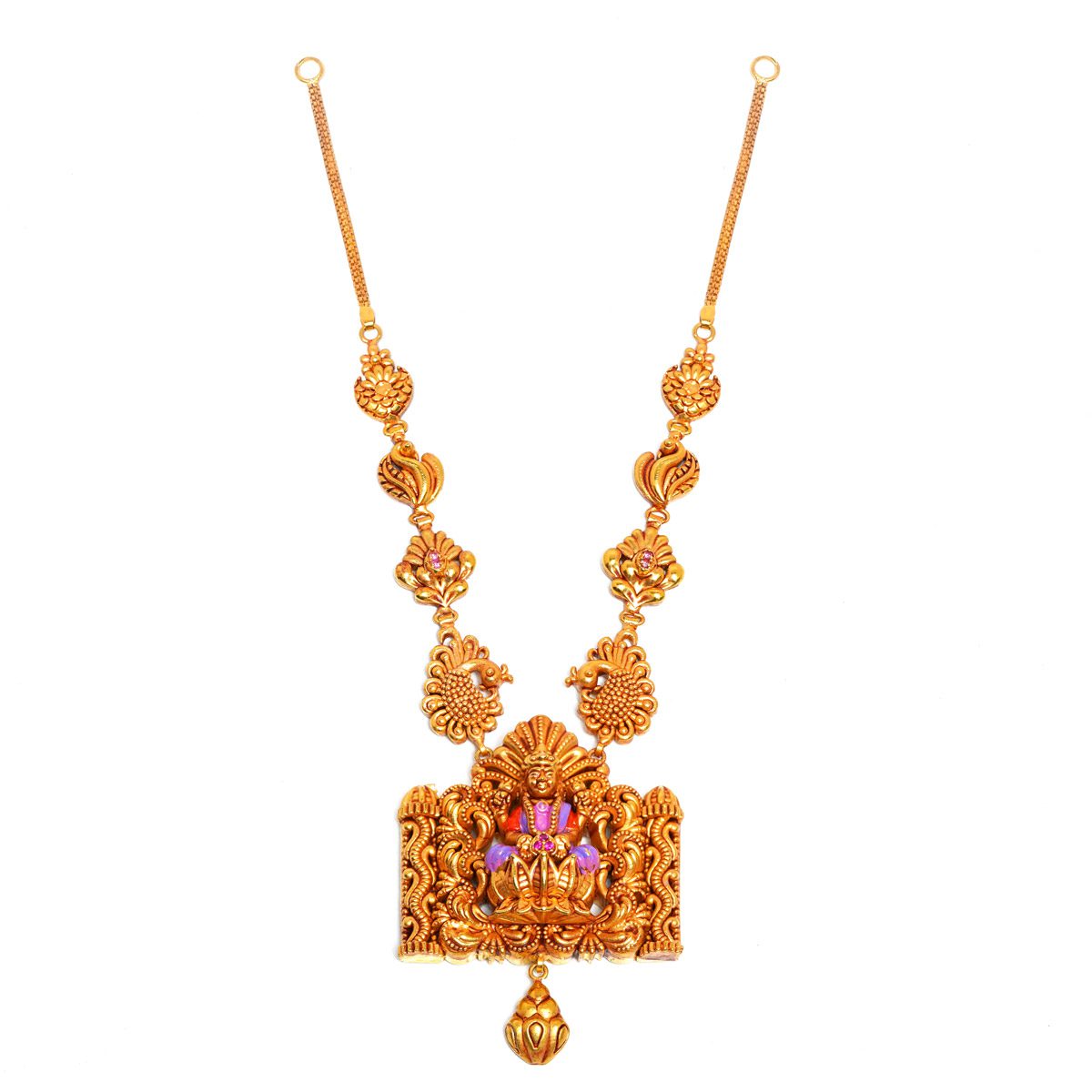 shop this exquisite 916 Gold Antique Temple Necklace featuring a divine Goddess Lakshmi pendant with purple enamel work and intricate peacock motifs. Perfect for traditional occasions