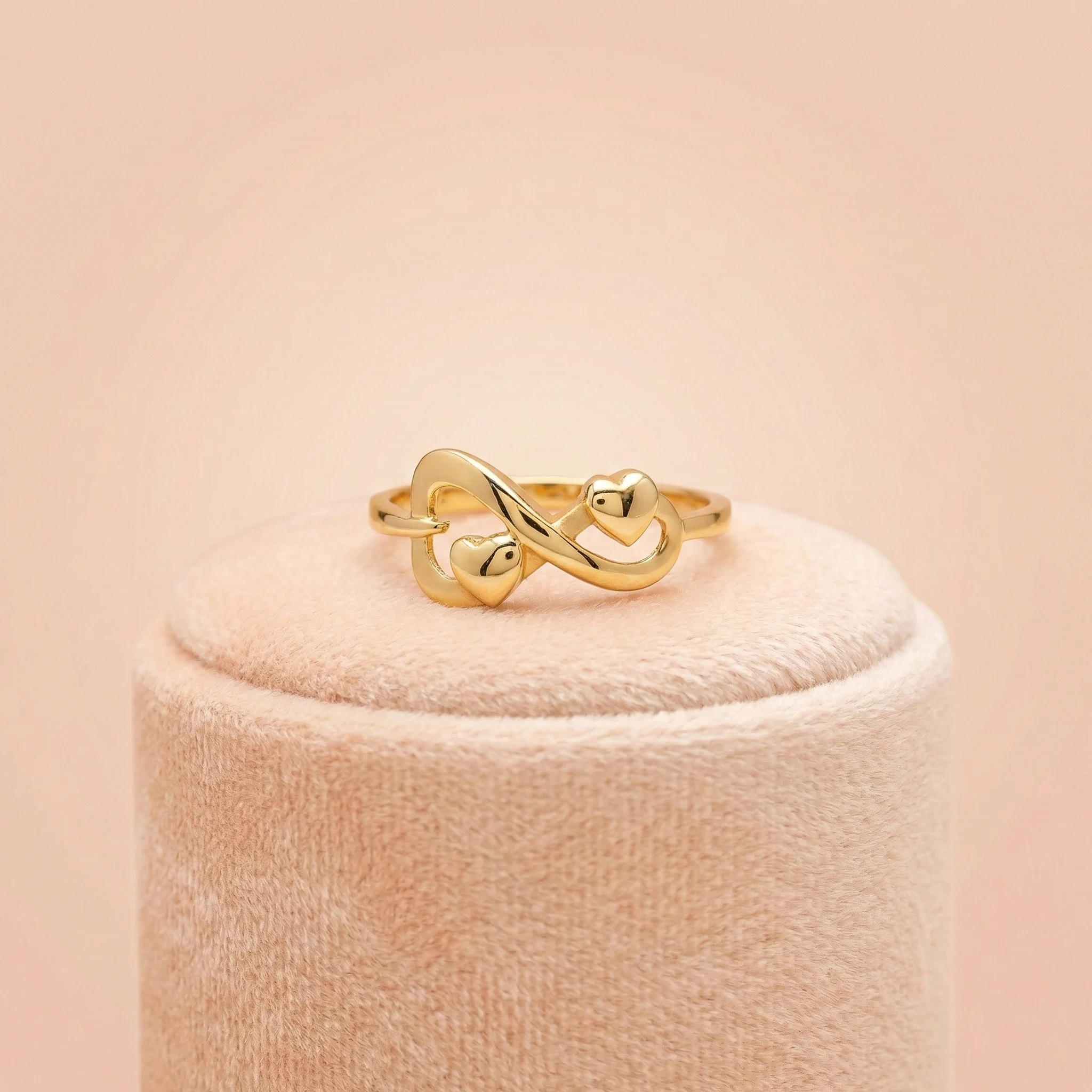 22K gold minimalist ring. Featuring a sleek infinity silhouette intertwined with two delicate polished hearts, this ring is the perfect blend of modern sophistication and timeless sentiment. Lightweight and comfortable for daily wear, it serves as a meaningful gift or a refined addition to your personal jewelry collection.