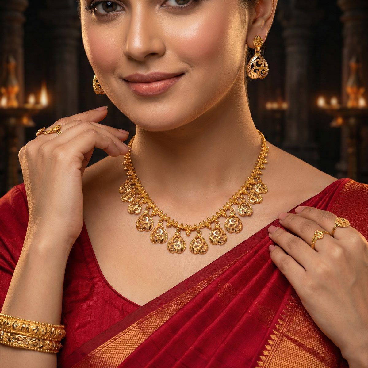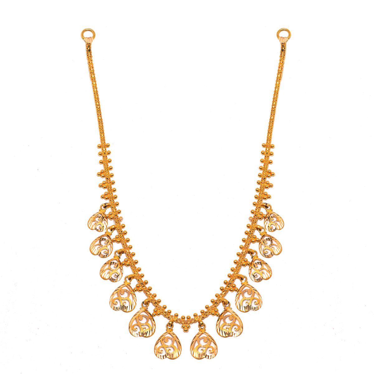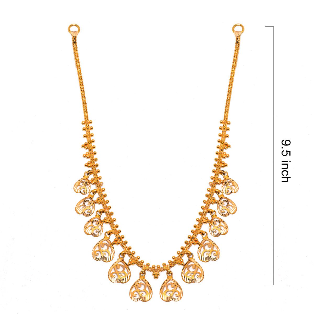 The elegance of this 22K 916 Gold Necklace featuring cascading filigree heart charms. A stunning 9.5-inch beaded chain design with intricate cut-work drops, perfect for festive wear and traditional occasions. Hallmark certified.