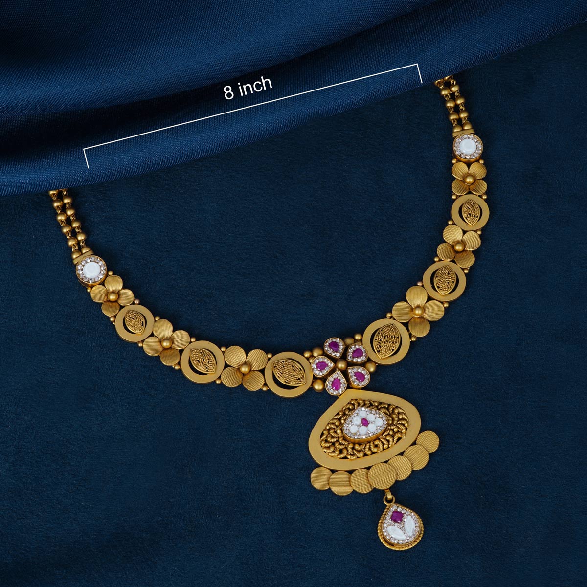 Featuring delicate textured petals and a stunning central drop pendant, this piece blends classic artistry with modern charm. Studded with high-quality cubic zirconia and ruby-colored stones, it is the perfect statement piece for the modern woman who cherishes tradition.