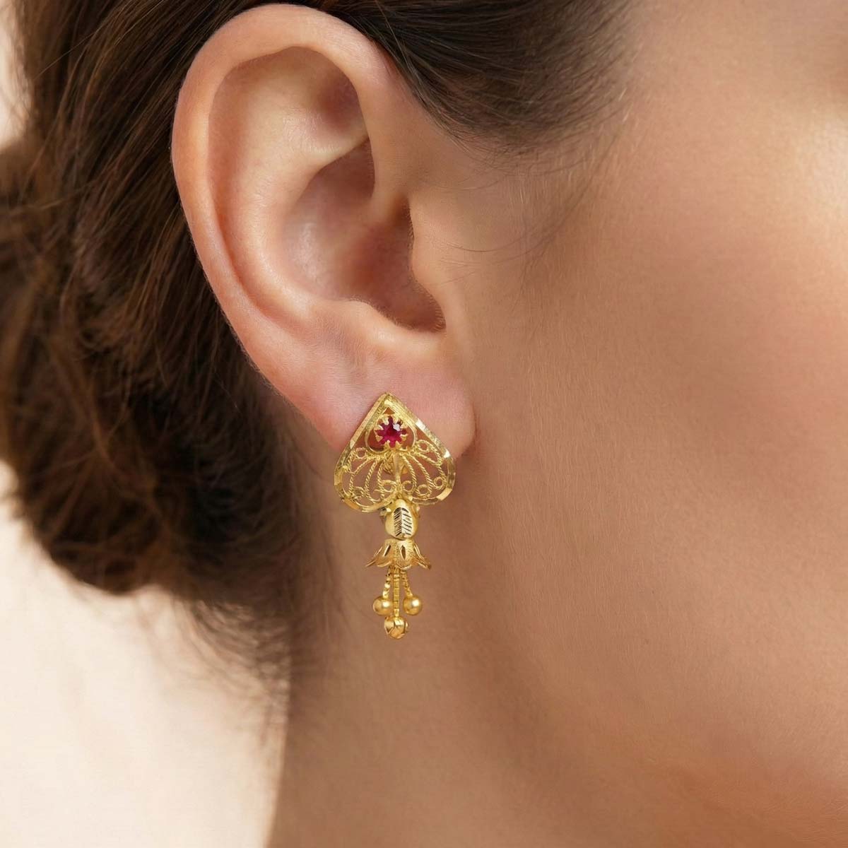 Elevate your everyday style with these exquisite 22K gold minimalist drop earrings from OVJ Jewels. Featuring a delicate filigree heart design centered with a vibrant red stone and finished with graceful hanging gold beads. Crafted for perfection and 916 Hallmarked. Shop authentic heritage jewelry online.”