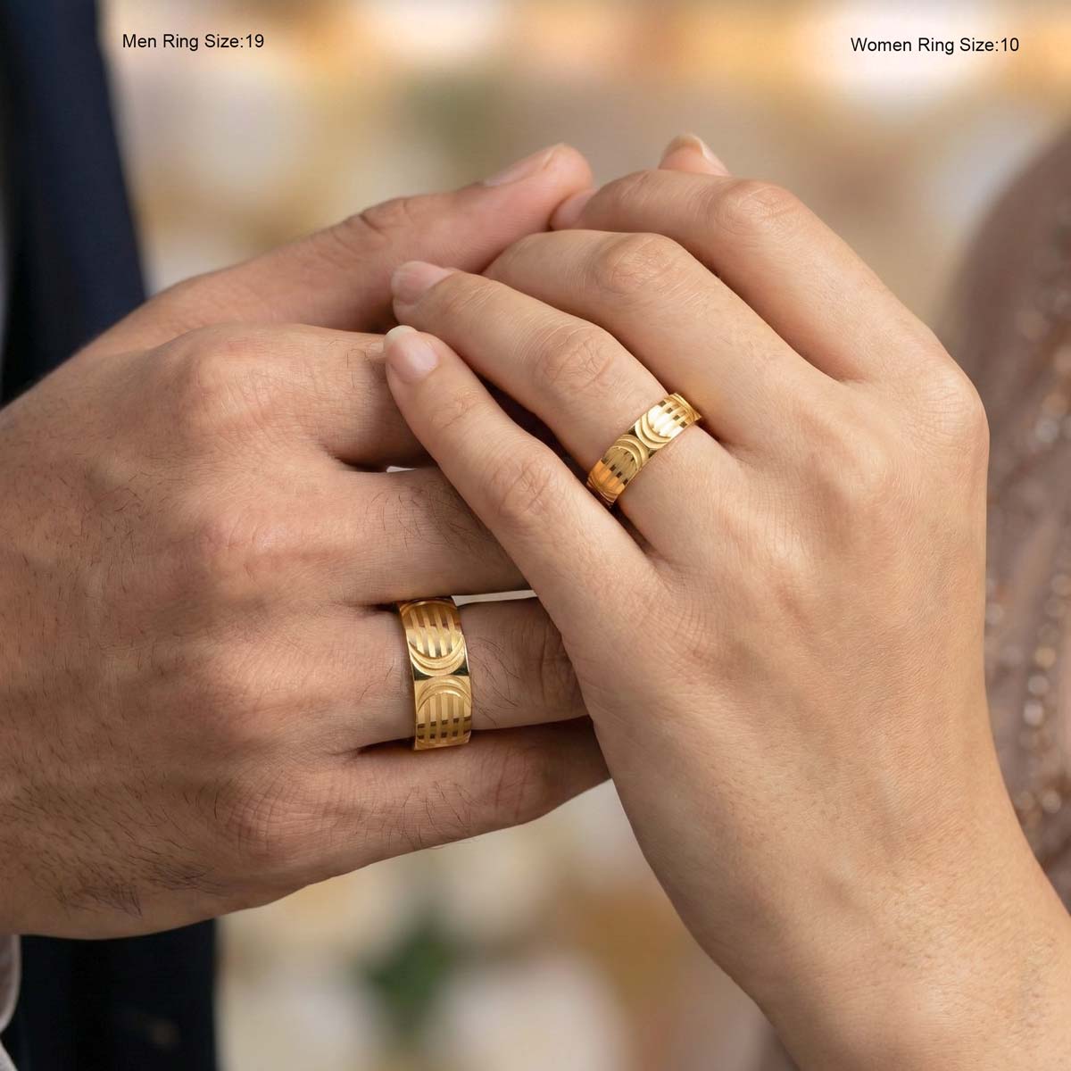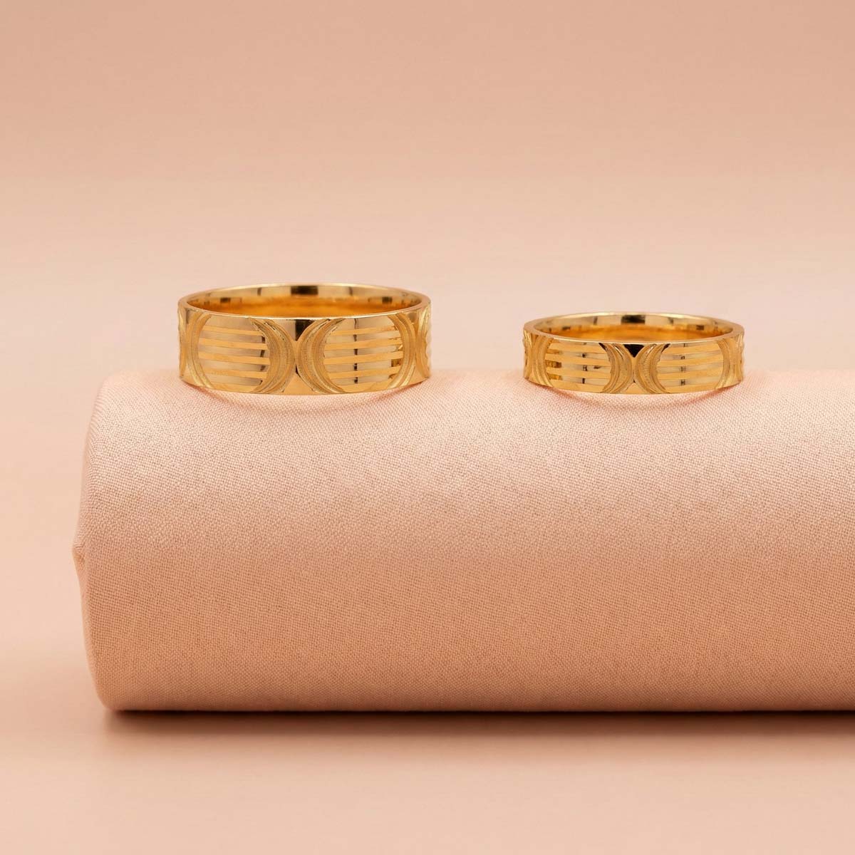 n: Celebrate your unique bond with these 22k gold minimalist couple rings. Featuring a contemporary geometric pattern and a sleek flat-band design, these rings are crafted for everyday elegance. Whether it’s an anniversary or a promise, these handcrafted bands from OVJ Jewels represent a love that is both modern and enduring.