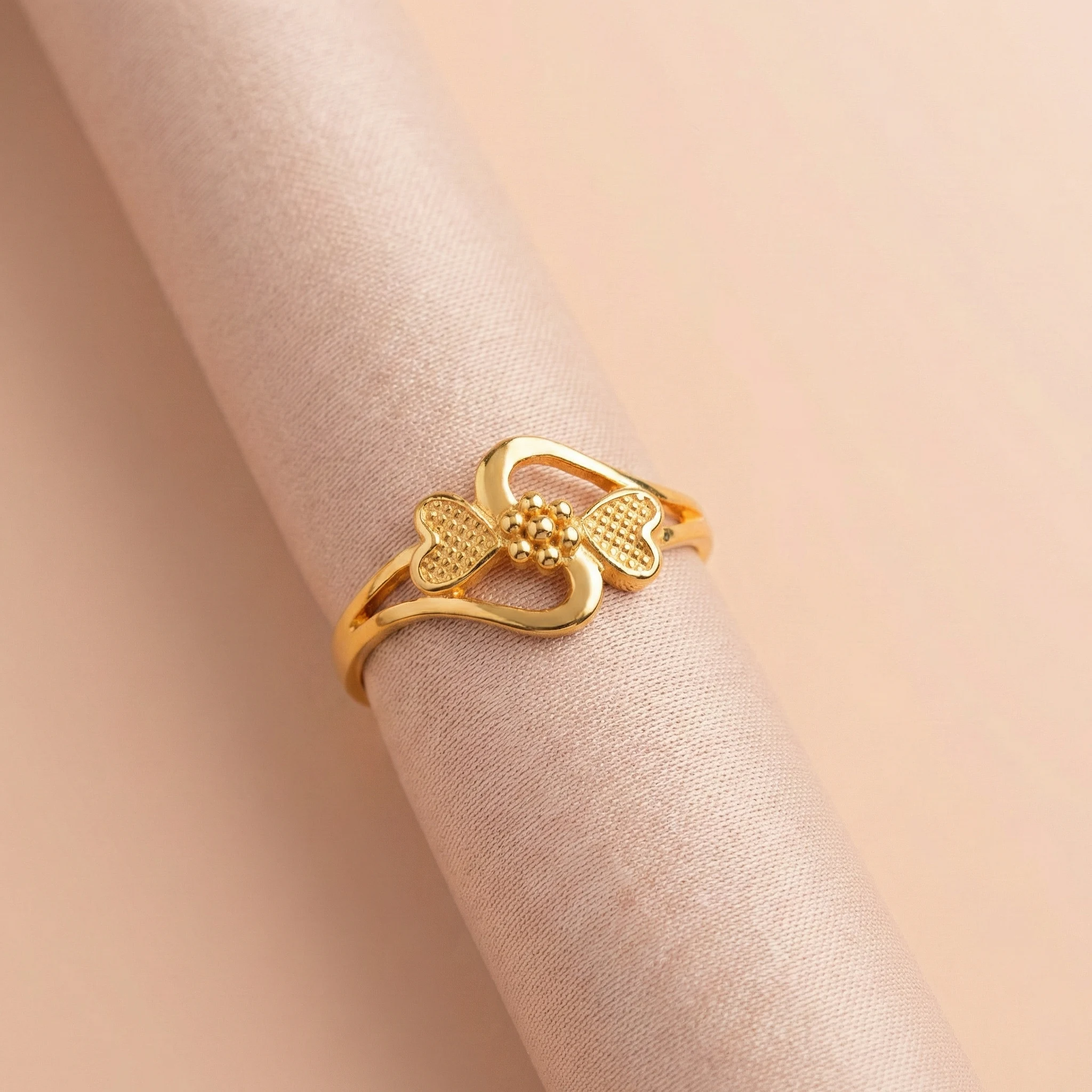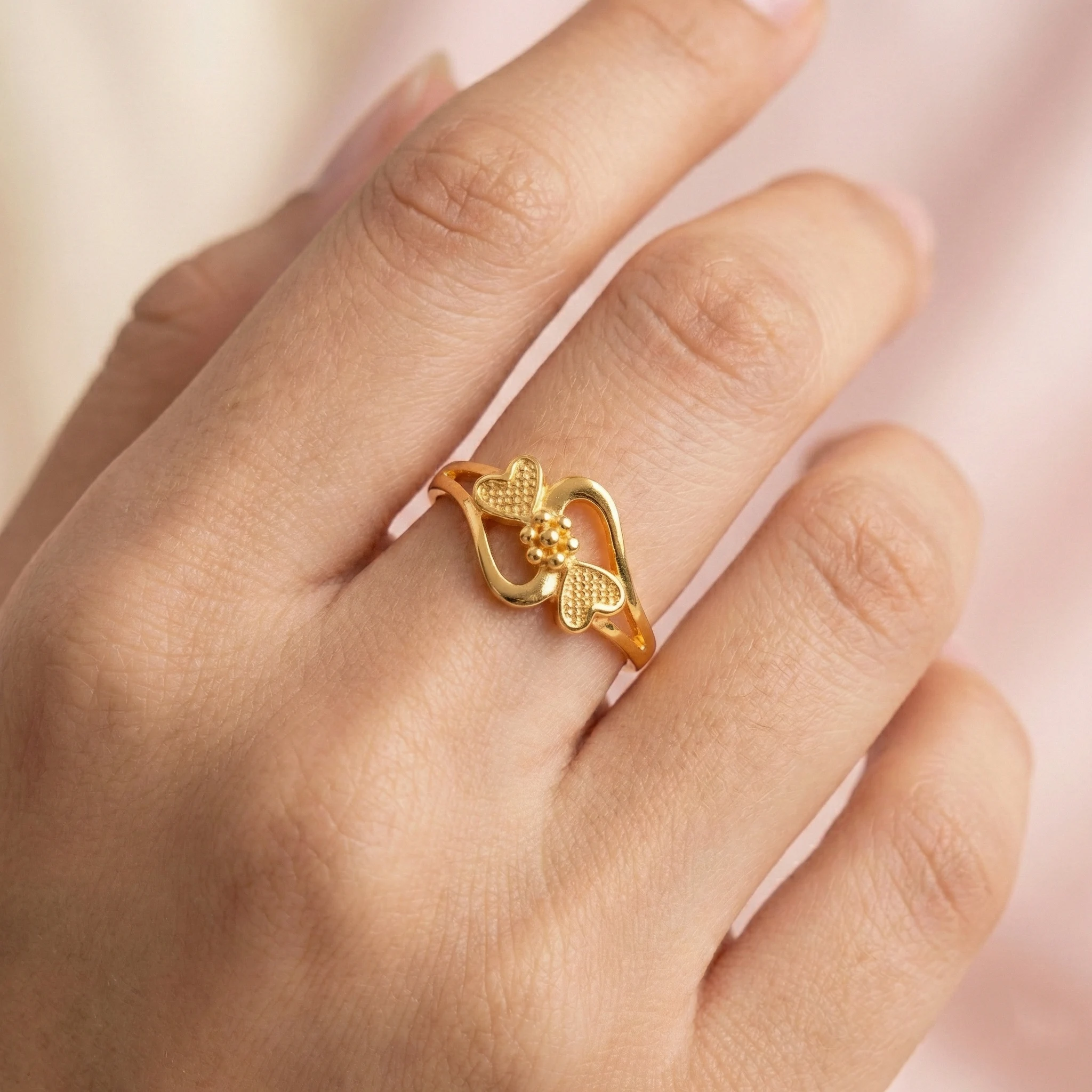 22K gold twin hearts ring, a masterpiece of minimalist elegance. This exquisite piece features two delicate hearts with a unique beaded texture, meeting at a central floral cluster for a touch of classic charm. Designed with a sleek, swirling bypass band, it offers a modern twist on traditional motifs that is perfect for both daily wear and special occasions.