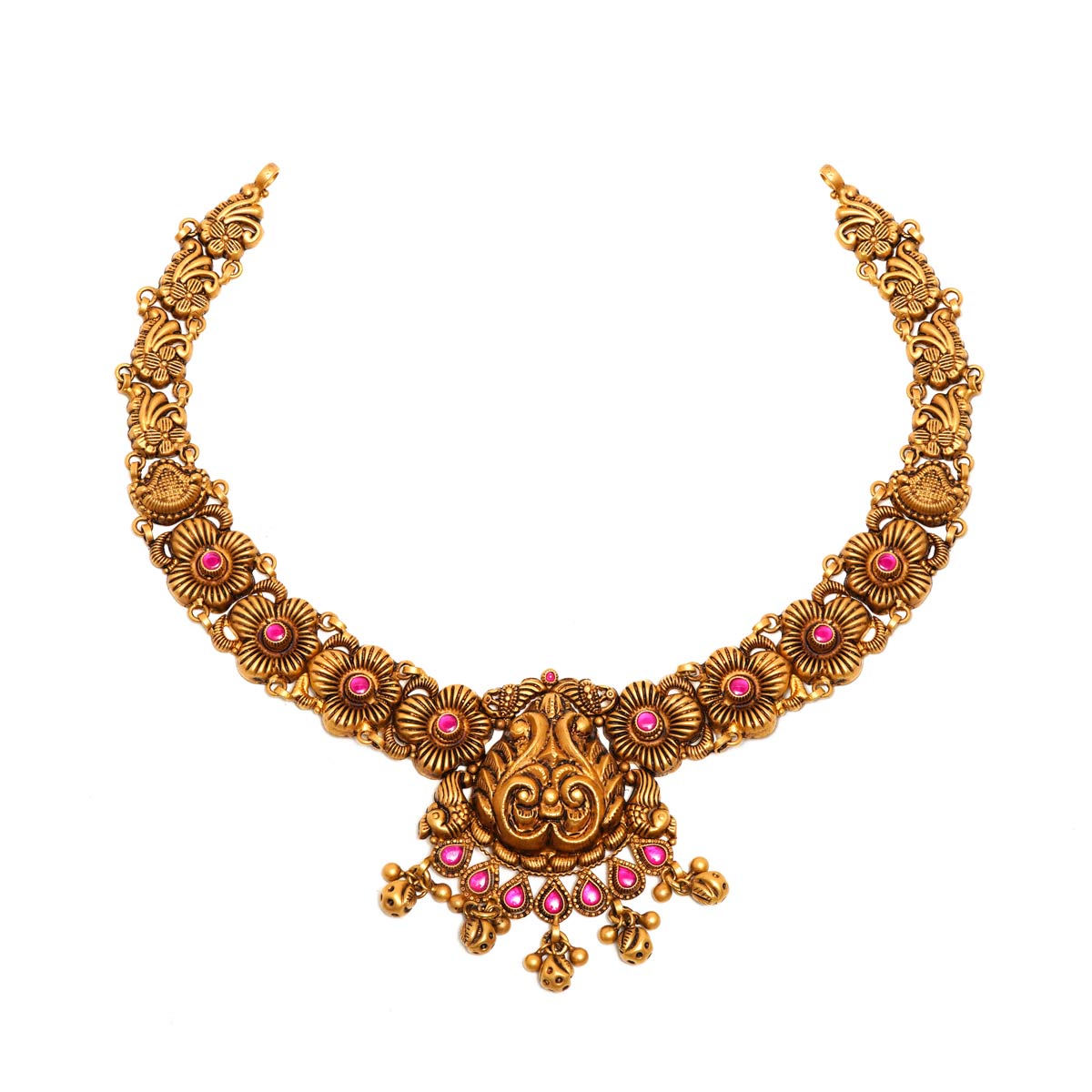 Masterfully crafted in 22K gold, this piece features a traditional temple jewelry design adorned with intricate floral motifs and vibrant pink stones. The centerpiece pendant showcases detailed peacock artistry with dangling gold beads, giving it a regal, timeless appeal