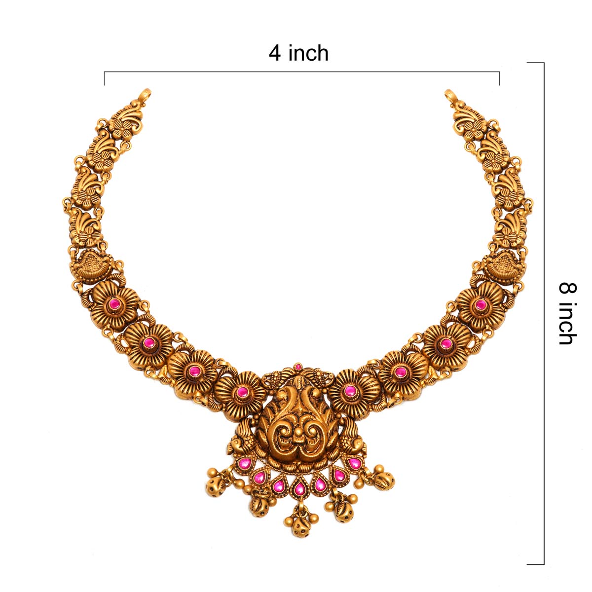 916 Gold Antique Finish Floral Necklace with Pink Stones