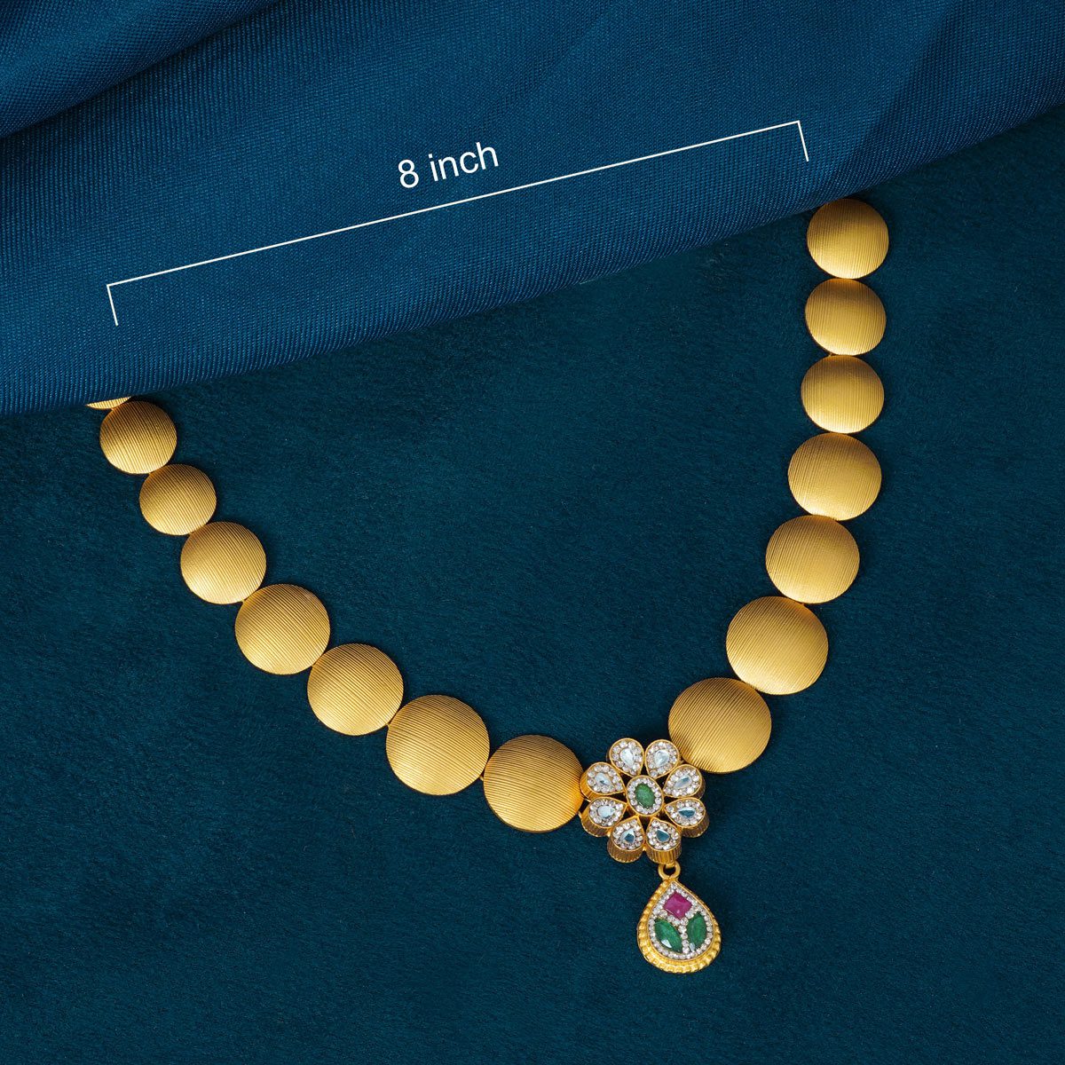 Discover elegant craftsmanship with this 22K gold necklace. Designed with smooth, matte-finished gold coins and accentuated by a floral pendant featuring vibrant emerald green stones and cubic zirconia. A graceful addition to any jewelry collection.