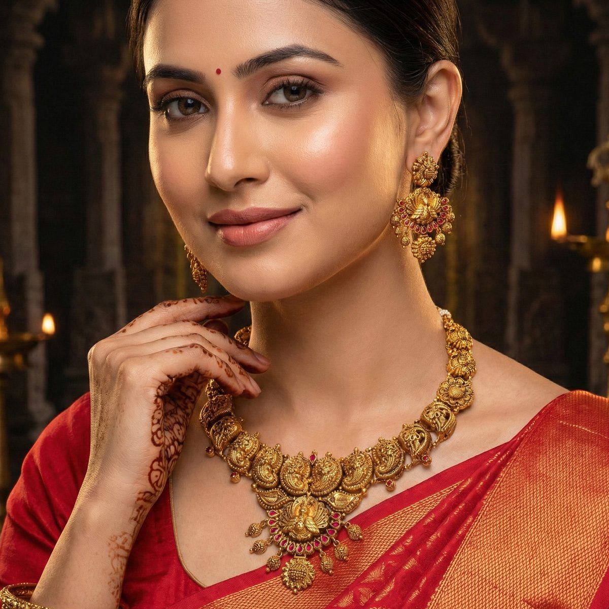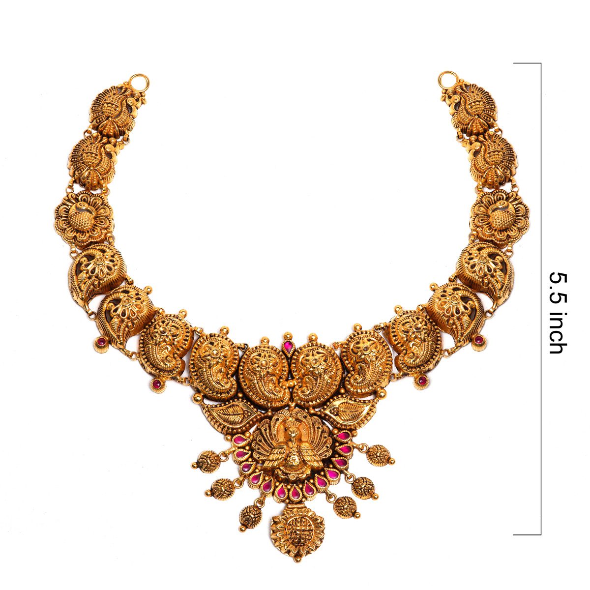 916 Hallmarked Gold Necklace. Crafted in a heritage antique style, this piece features a classic South Indian Mango (Manga) chain leading to a majestic Peacock (Annam) pendant. Adorned with vibrant red stones and hanging gold beads, it is the perfect bridal accessory.