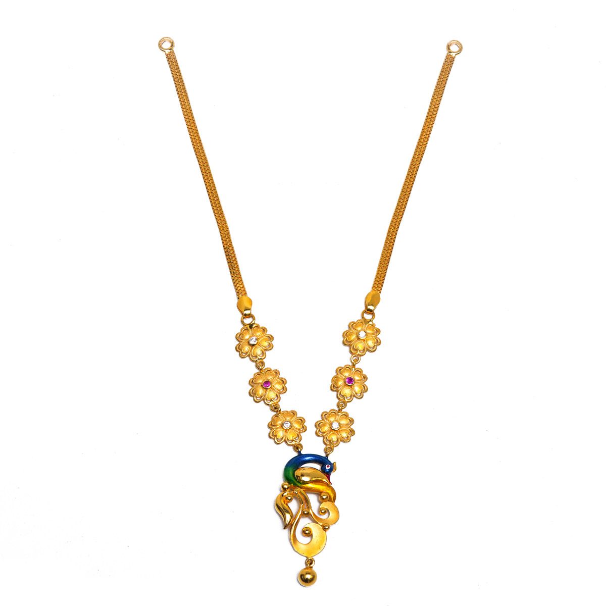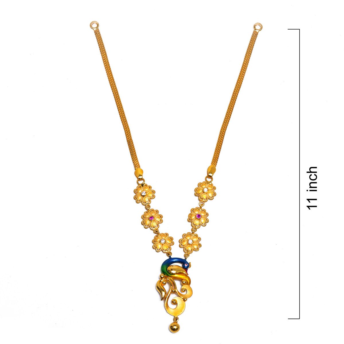 Featuring a vibrant enamel (Meenakari) peacock pendant connected by delicate floral motifs set with pink and white stones. This 11-inch gold chain offers a perfect blend of classic artistry and modern elegance, making it ideal for festive occasions and weddings.
