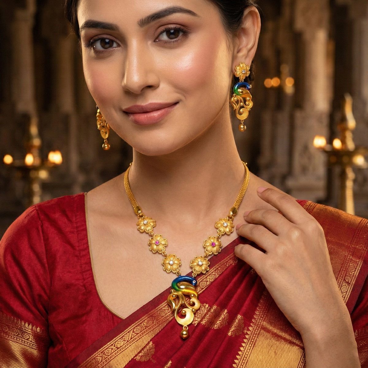 916 Gold Peacock Enamel Necklace with Floral Motifs