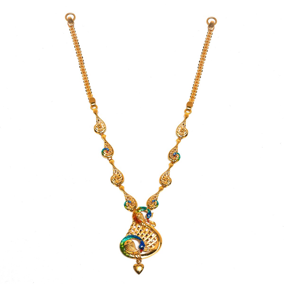 916 Hallmarked Gold Necklace. Featuring a stunning peacock (mayur) motif accented with vibrant blue and green enamel (meenakari) work, this 12-inch necklace blends classic artistry with modern elegance. Finished with a delicate heart charm, it is the perfect lightweight gold jewelry piece for festive occasions and daily wear.