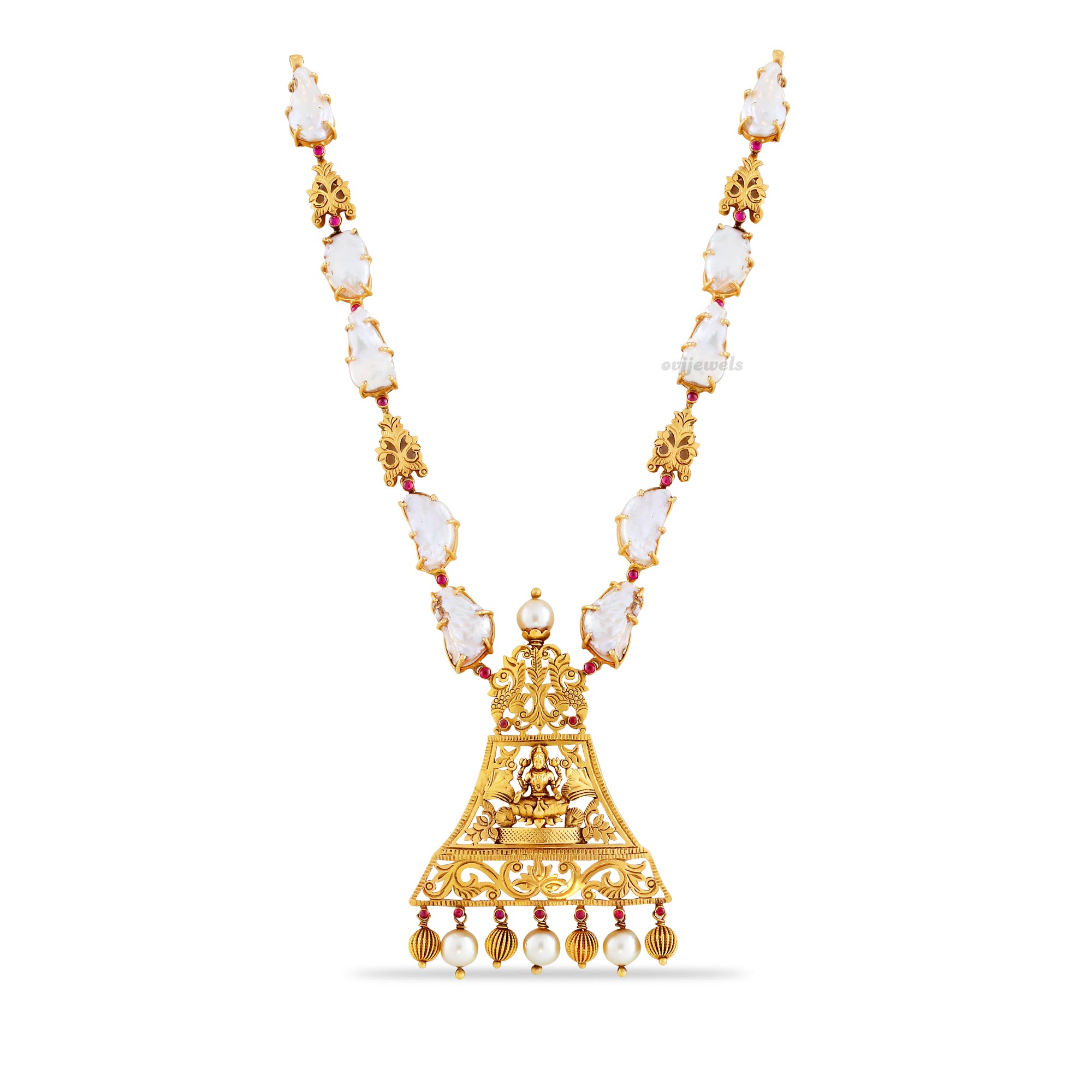 This 22k long gold necklace is alluringly accented with stones reflecting an enchanting indian jewel tradition.