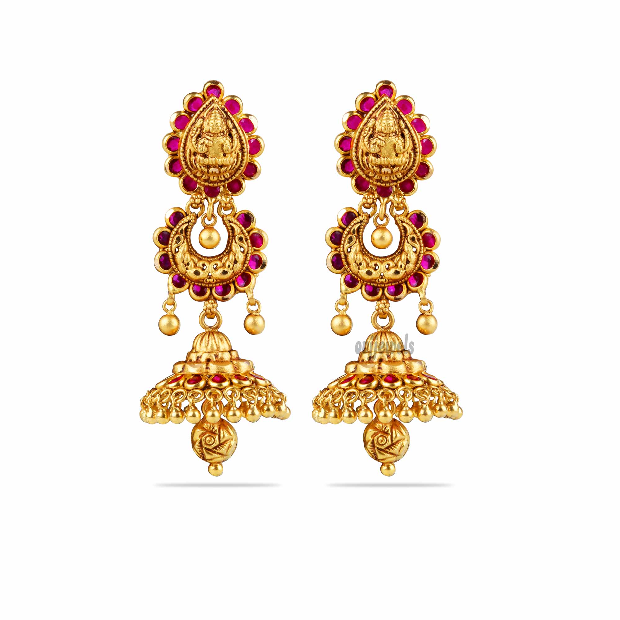 This 22k gold Traditional Lakshmi jhumkas studded with precious kemp stones.