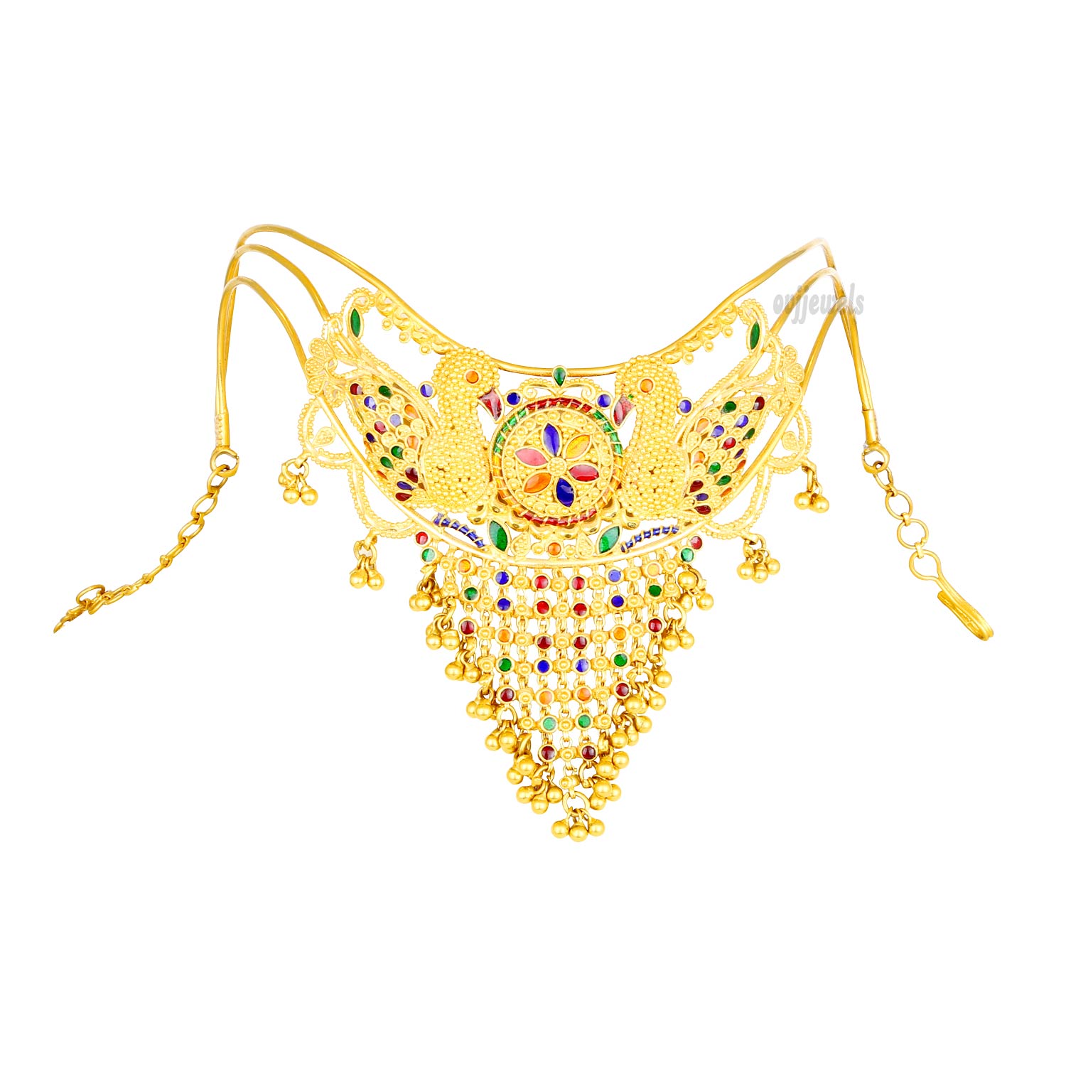 22k yellow gold vanki or arm-band with a reddish polish. Set with Color Full fancy stones and embellished with hanging With Gold beads.
