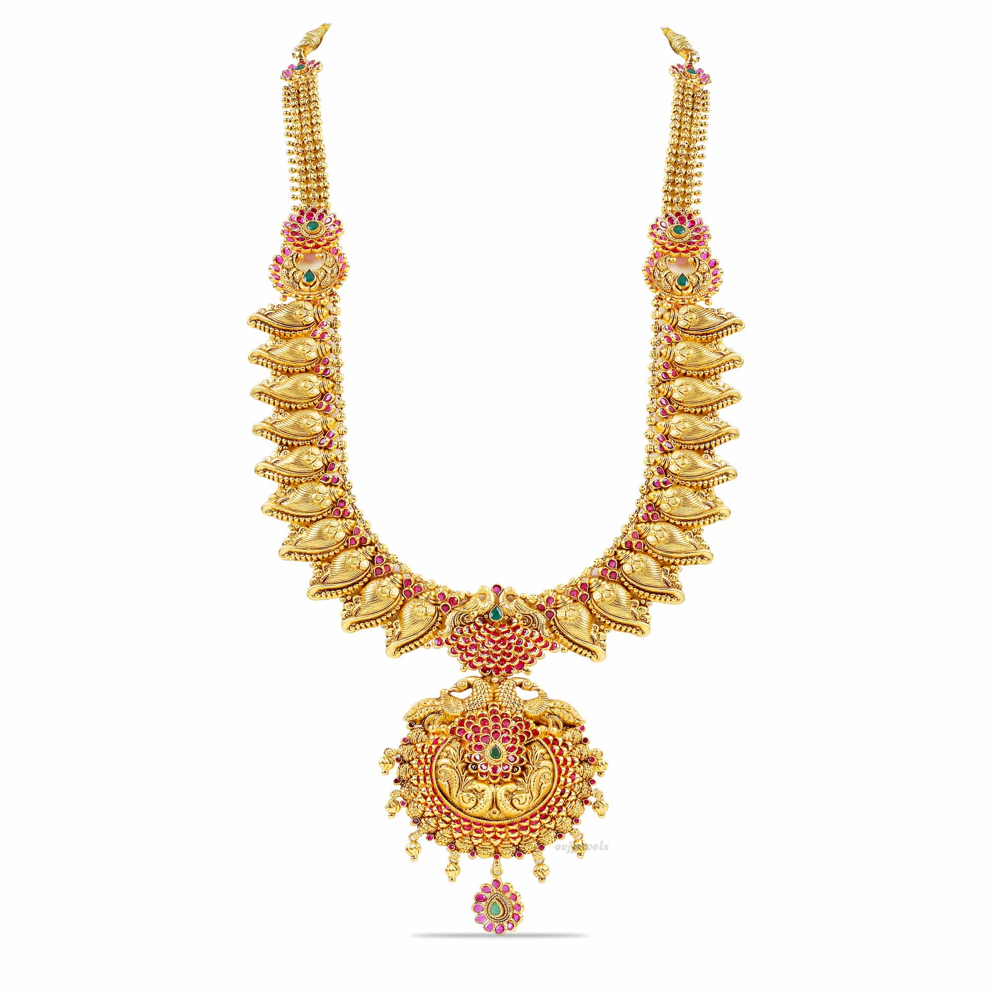 This 22k gold long necklace is studded with ruby and emerald stones and has fine finish.