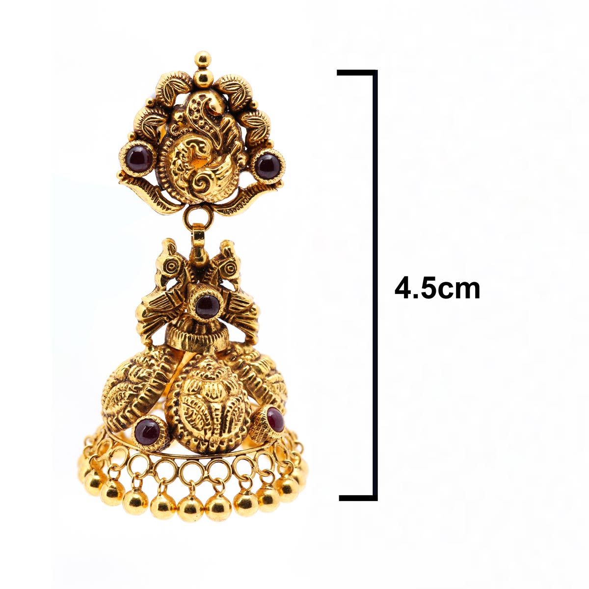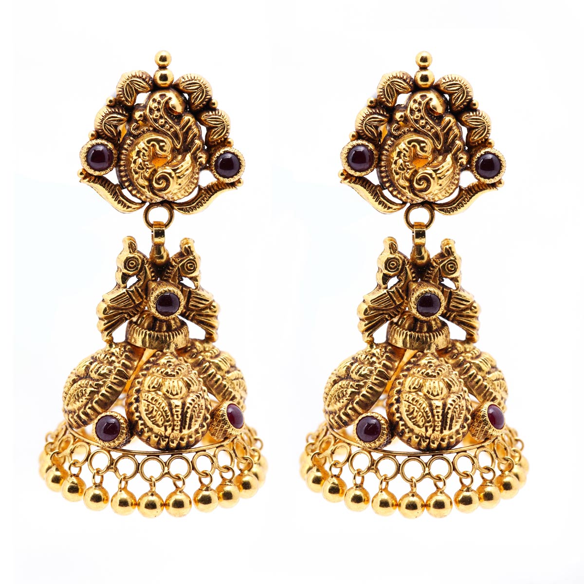916 Gold Temple Jhumka Earrings. Crafted from high-purity 916 (22K) gold, they boast a stunning antique finish and intricate traditional design. The stud features a magnificent peacock motif