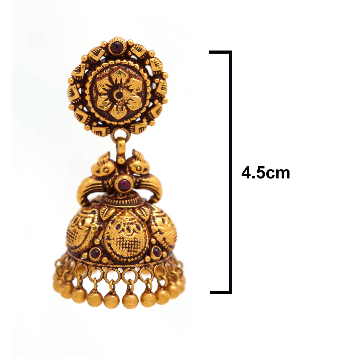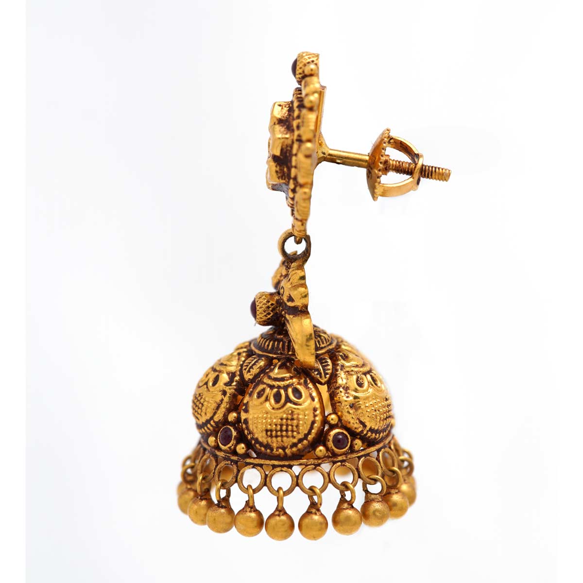 Antique 916 Gold Temple Jhumka.The design features a beautiful circular floral stud connected to a traditional bell-shaped jhumka decorated with subtle peacock and deity motifs.