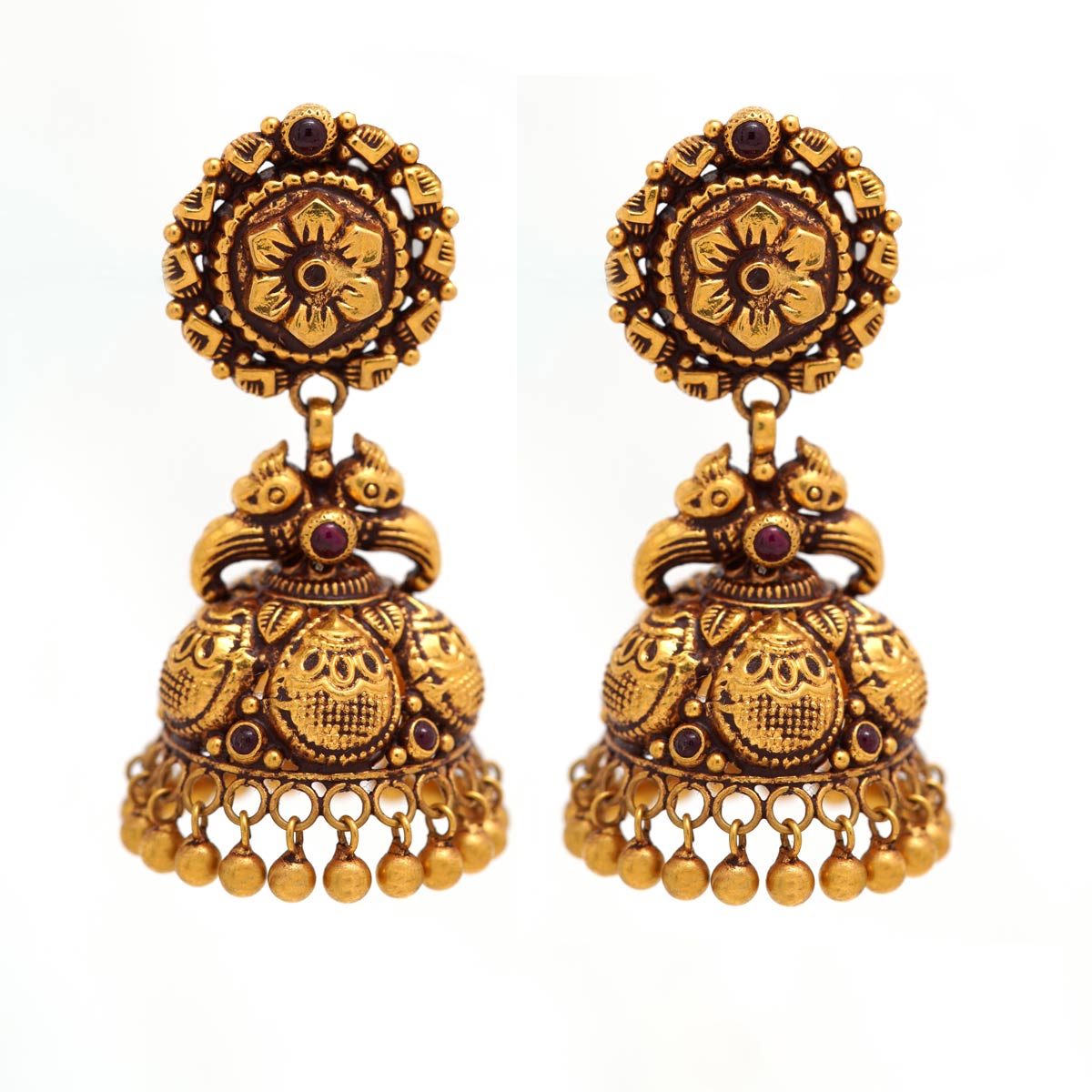 Antique 916 Gold Temple Jhumka.The design features a beautiful circular floral stud connected to a traditional bell-shaped jhumka decorated with subtle peacock and deity motifs. Ideal for pairing with sarees or lehengas, they are the perfect traditional accessory for weddings, festivals, or cultural events. Add this magnificent, heavy-look piece to your ethnic jewelry collection.