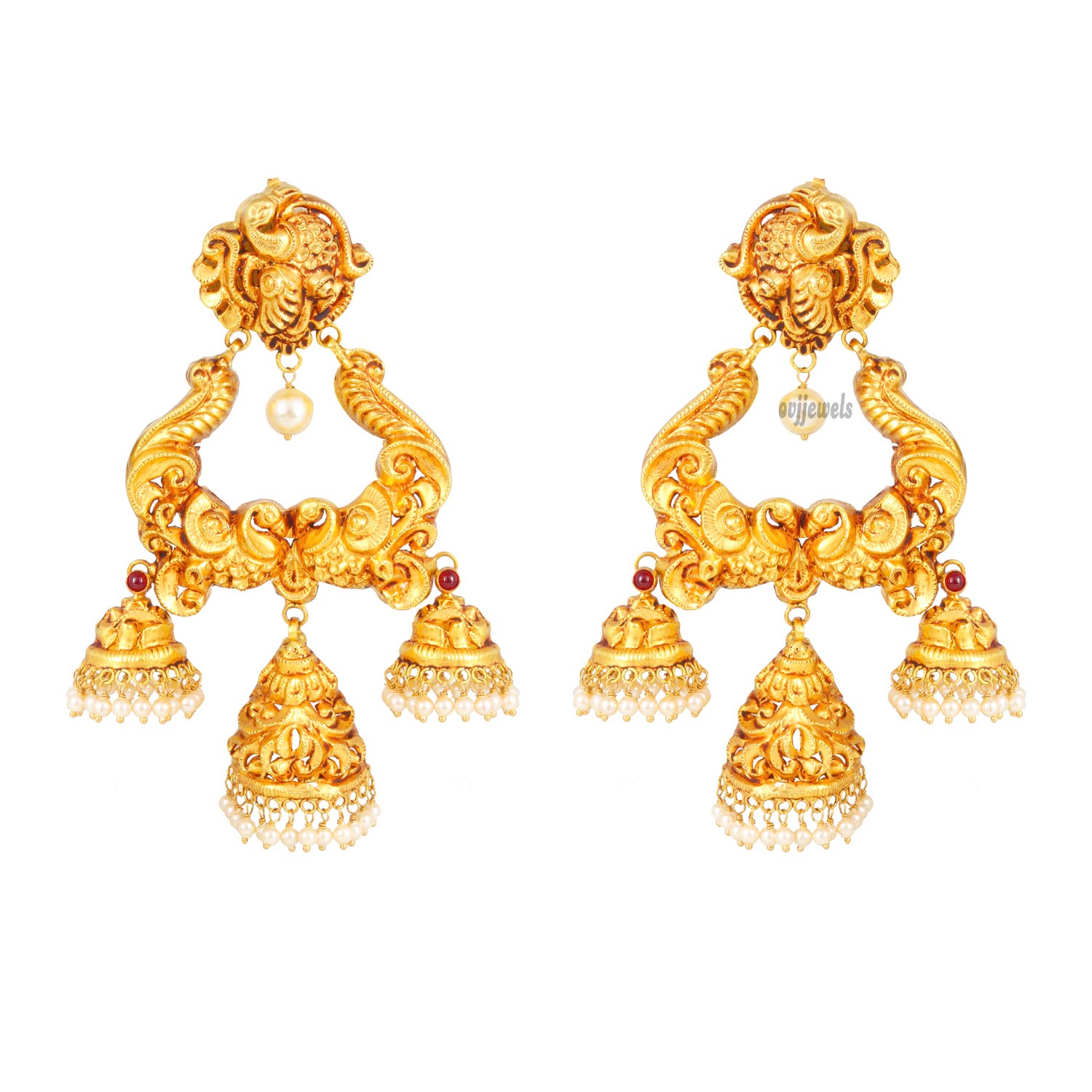 Beauty and come to life in these nagas gold stud and jhimikki earrings. the pair features ornate shaped antique studs, with intricately designed jhimikki danglers beneath.The 22kt studded in the kemp and pearl design, making the earrings royal to the hilt…