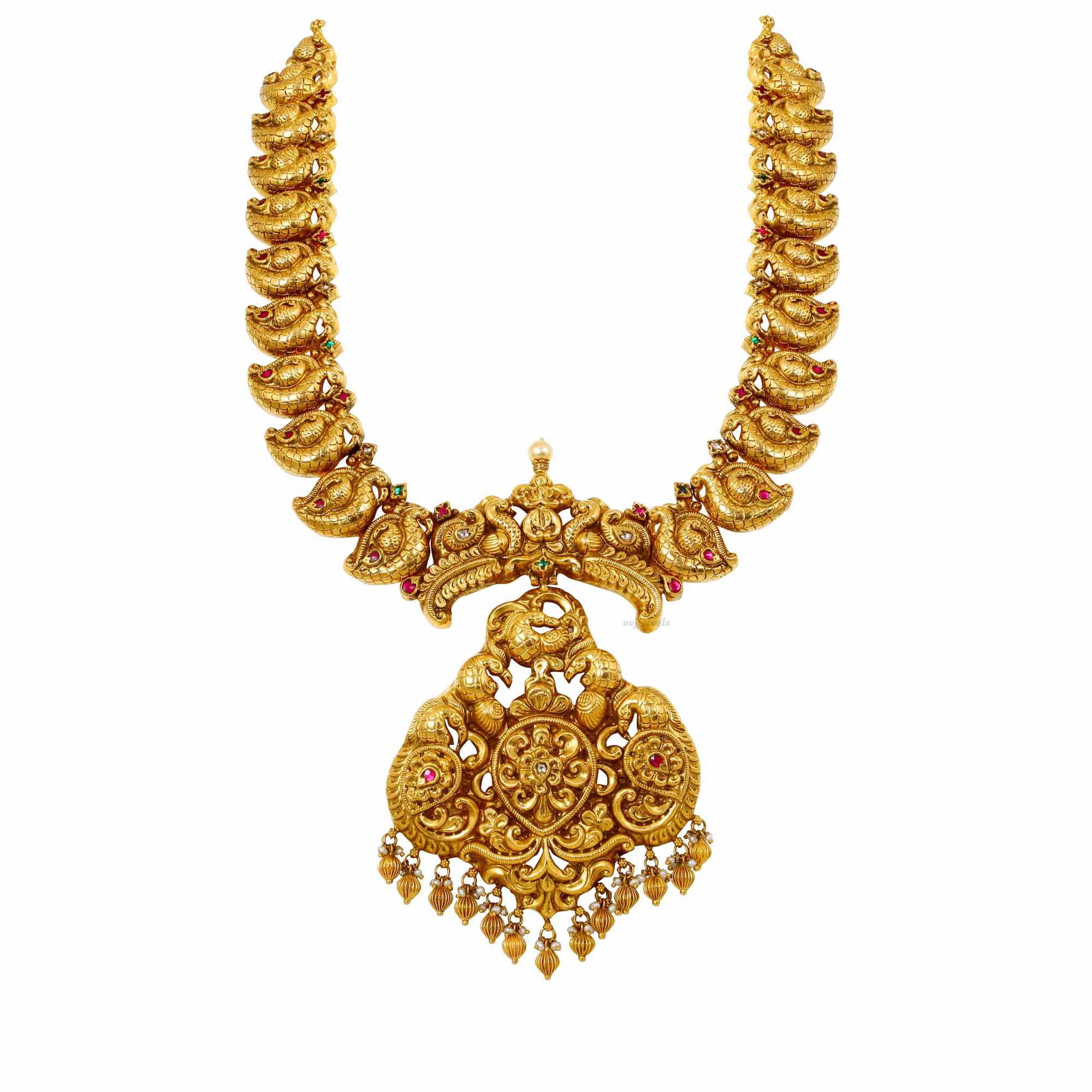 A striking 22k gold long necklace grandly decorated with pearls and ruby danglers.