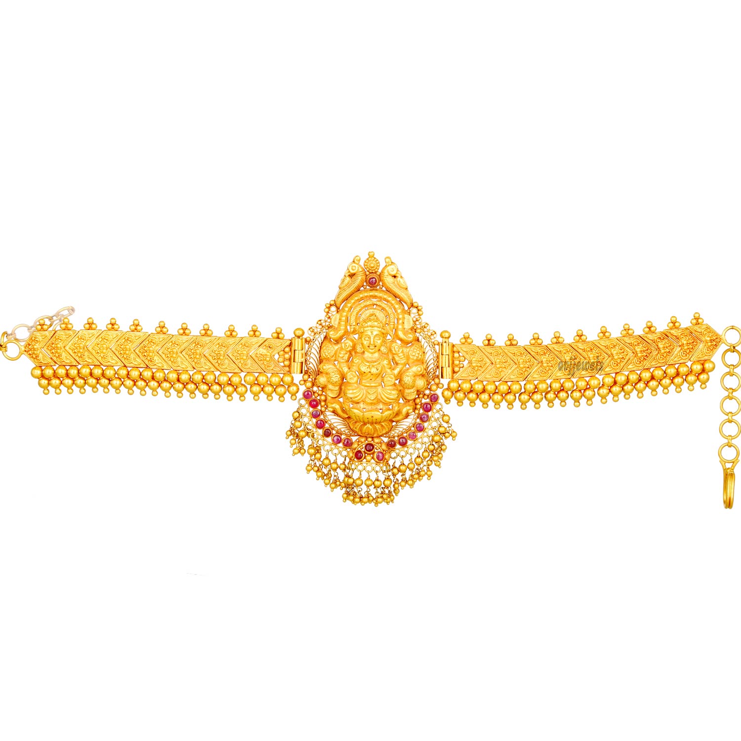 Sanctified 22k yellow gold vanki or arm-band, featuring the goddess Lakshmi and annapakshi studded with kemp stones. Further detail is added by the hanging scallops of the golden beads.