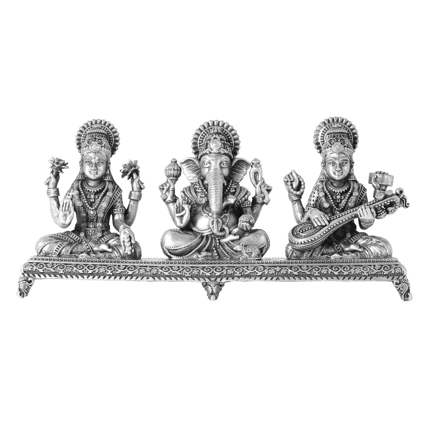 A 92.5 silver Lakshmi Ganesha Saraswathi Idol is a beautiful and auspicious piece of art. The antique idol is intricately crafted by skilled artisans