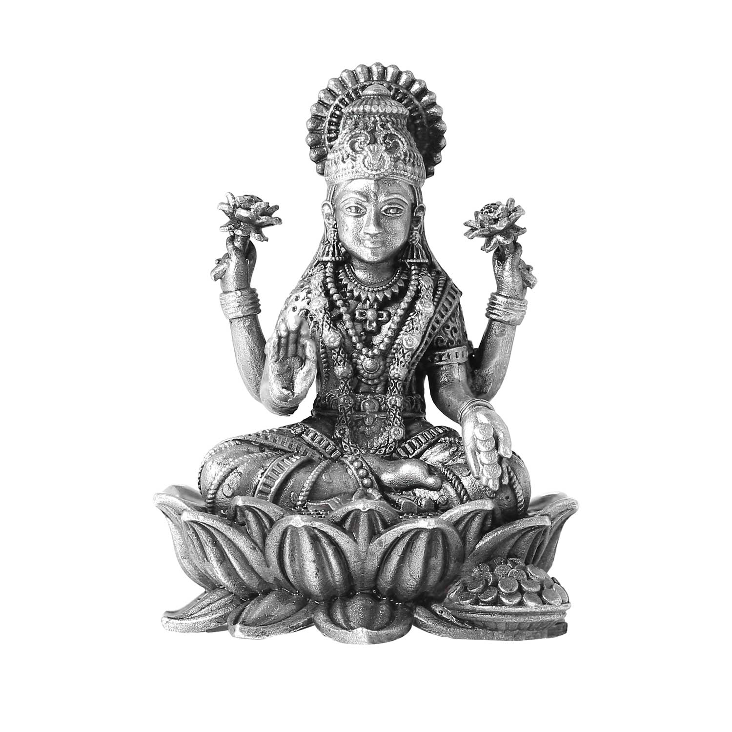 A 92.5 silver Lakshmi on Lotus Idol is a beautiful and auspicious piece of art. The antique idol is intricately crafted by skilled artisans