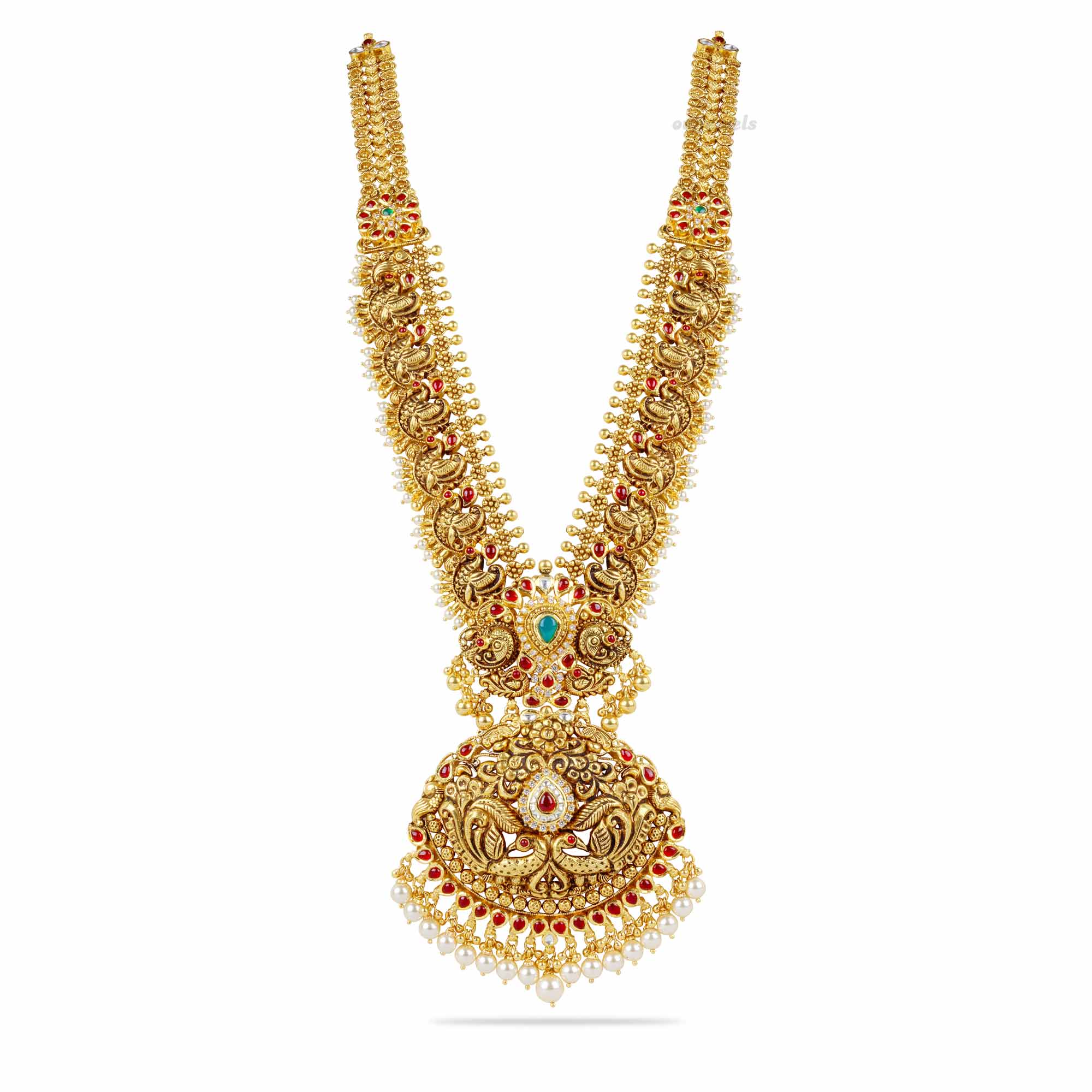 An elaborately designed gold long necklace lavishly adorned with bright kemp and emerald stones and pearls.