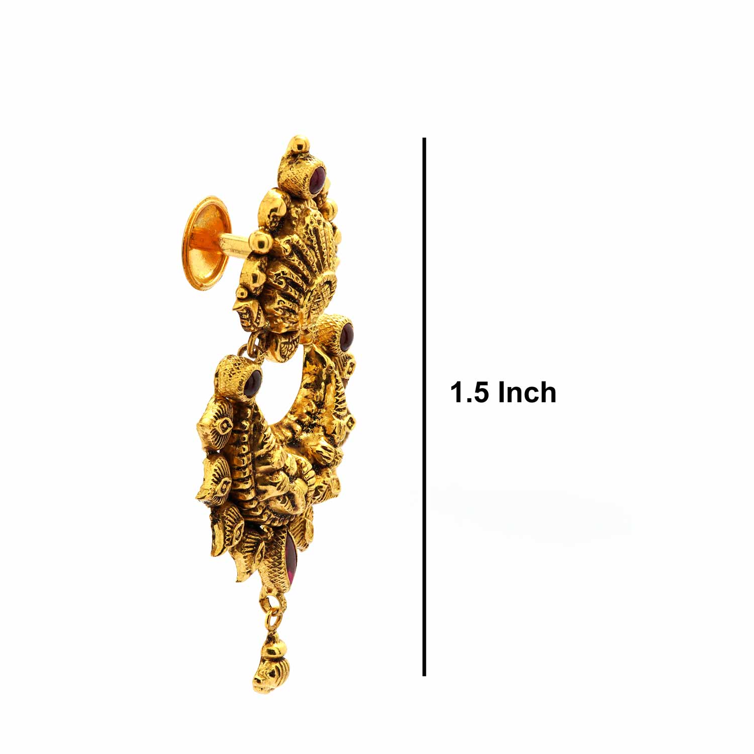Antique Matte Gold Chandbali Earrings. They feature a rich Temple Design with intricate carvings, a detailed top motif, and a striking lotus-like border. Accented with deep ruby-colored stones, these drop earrings capture timeless traditional grandeur.