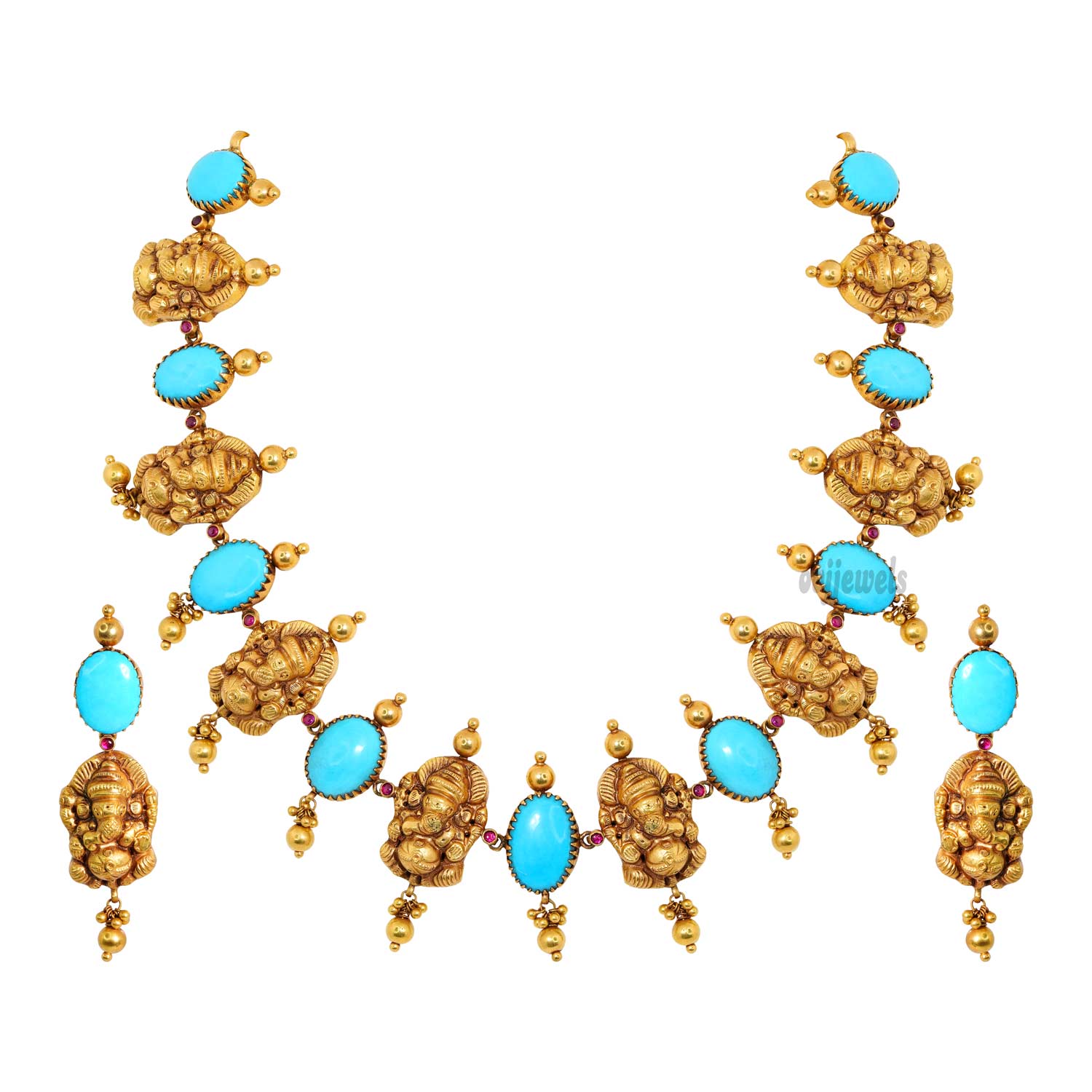In a 22kt gold, blue precious stones studded short necklace with matchings earrings handcrafted with superior quality by top-class karigars of India.