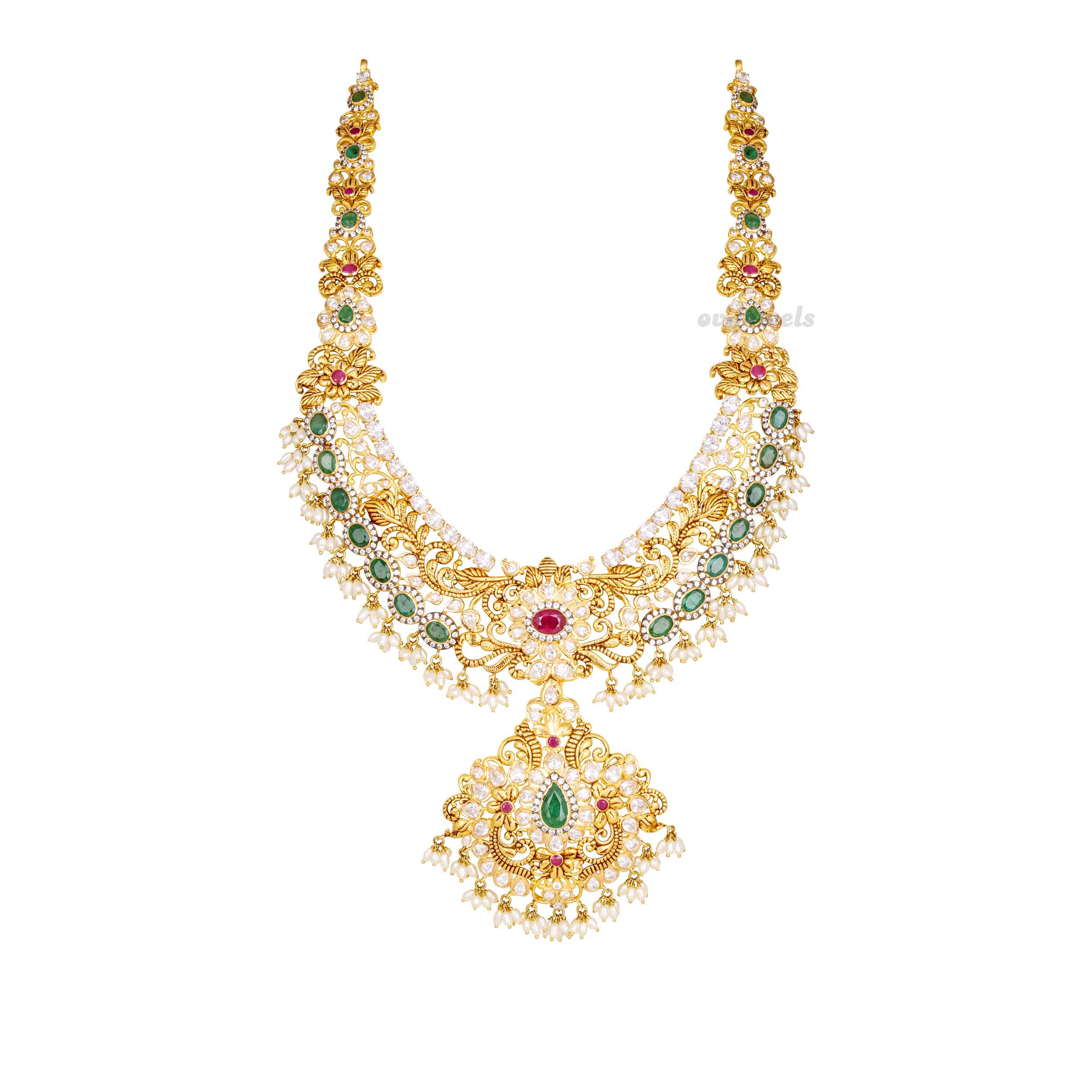 This 22k golden long necklace is highlighted with semi uncut polki stones and pearls drops to make it look trendy.