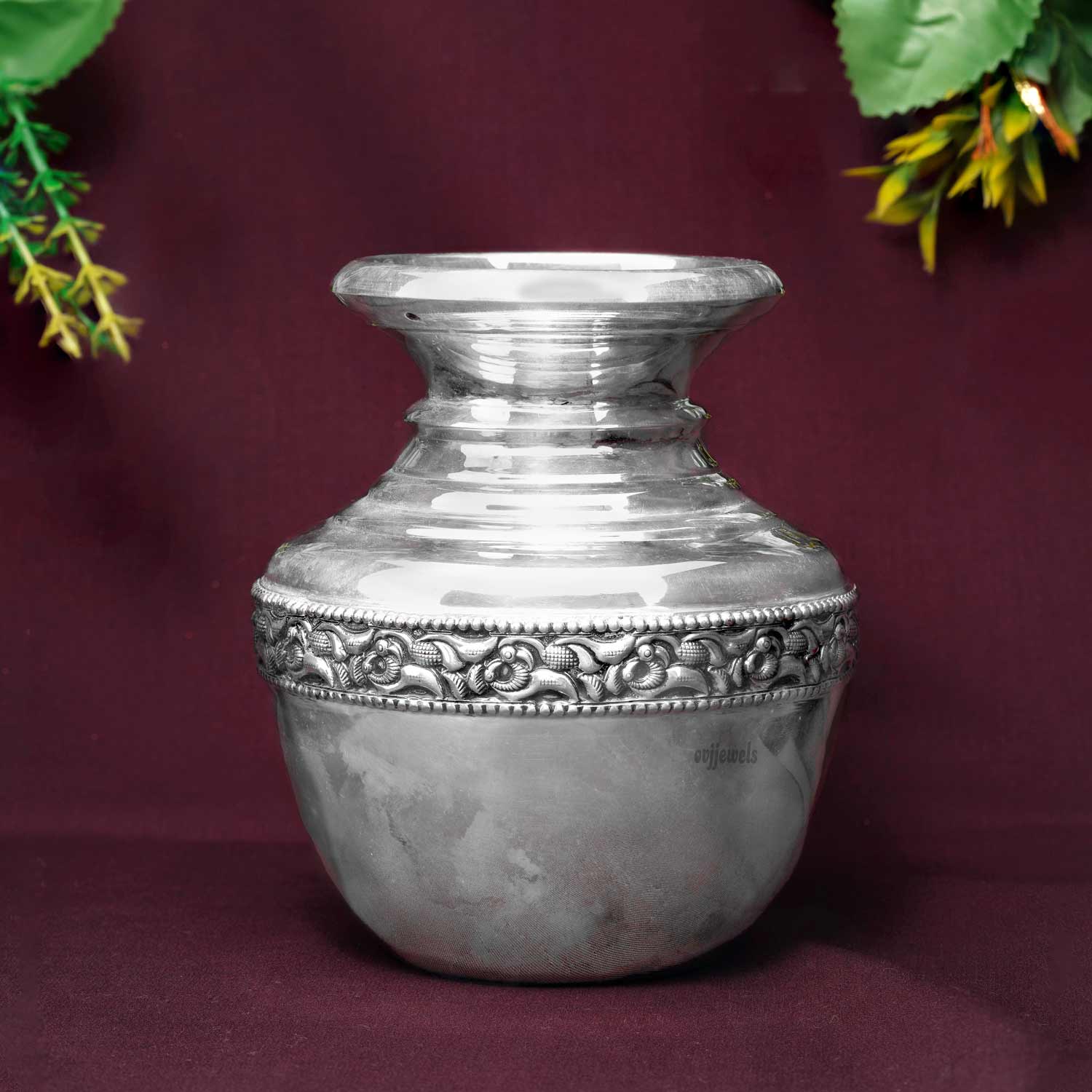 The Antique Pooja Kudam is meticulously crafted with intricate details, reflecting the artisan’s skill and reverence for religious rituals.