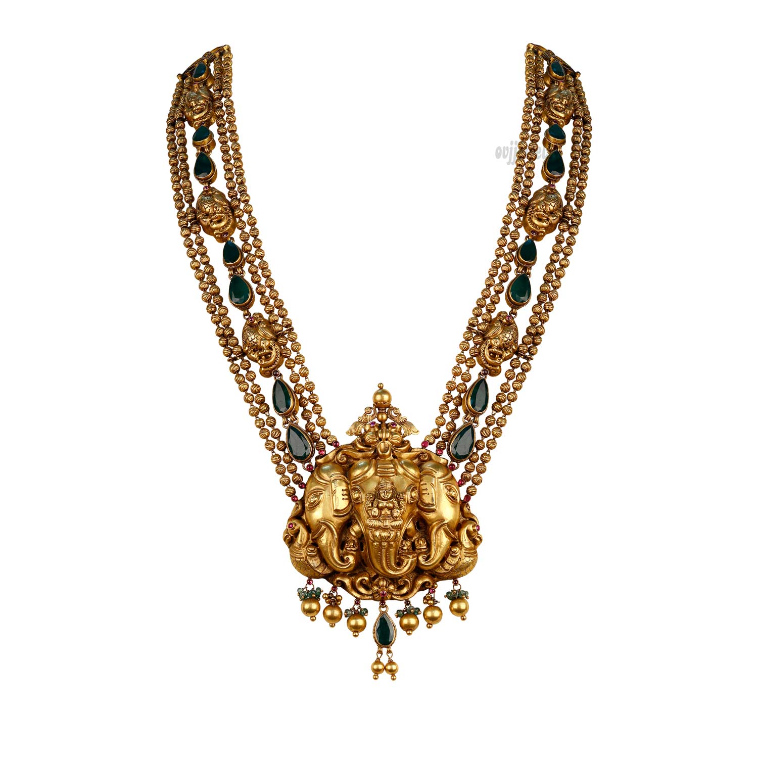 Overstate your fancy look with this 22k gold long Long necklace beautified by emerald, in a distinct pattern.