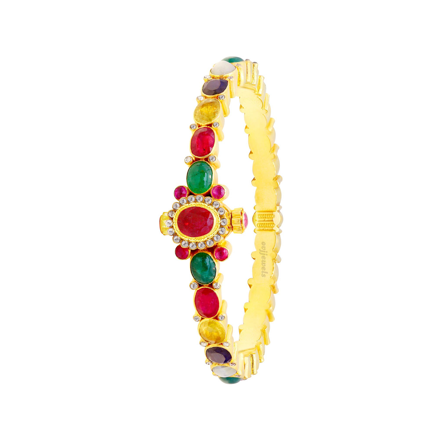 This golden is embossed with navarathna stones in a grand decorative paisley pattern.