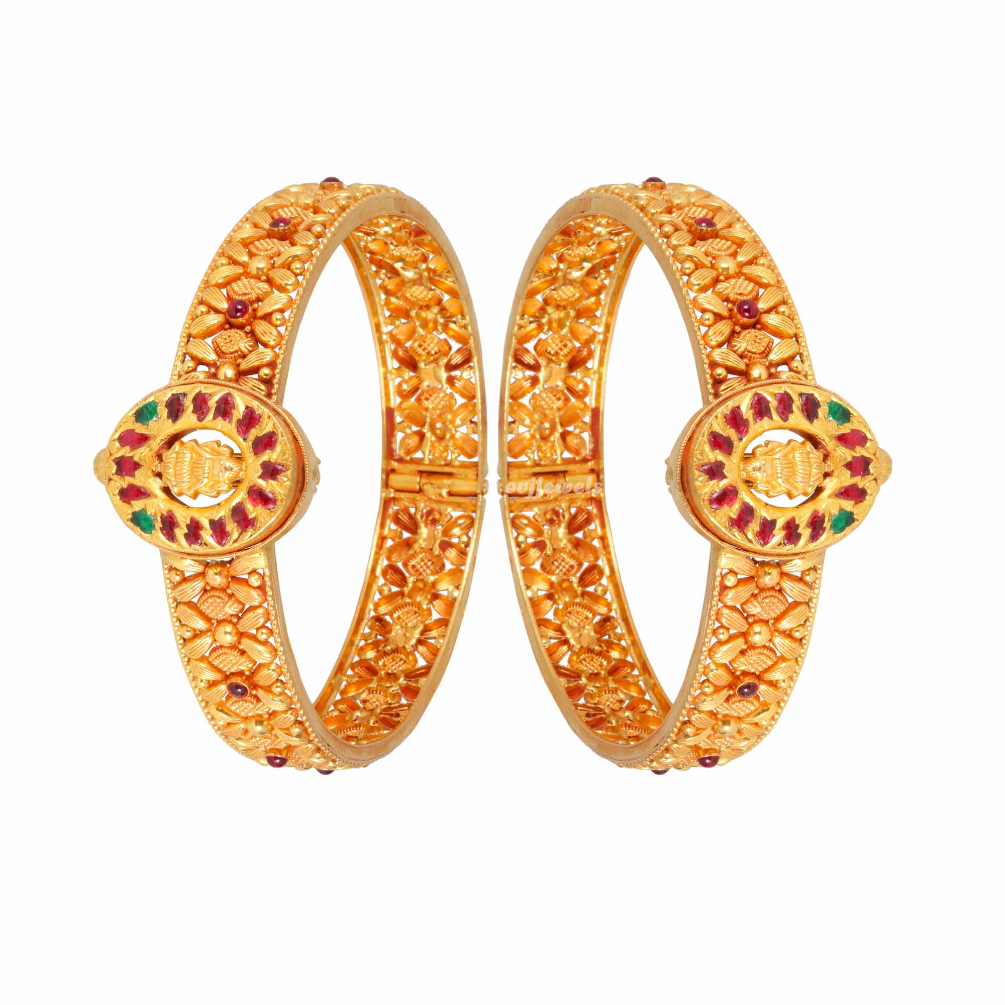 A golden surprise awaits you in the form of this pair of fascinating 22k gold bangles highlighted with vibrant stones work.
